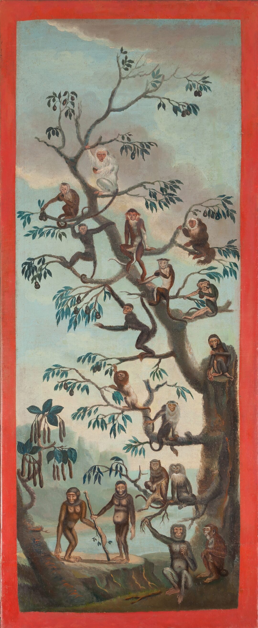 Arrivée dans les collections en 1993, cette huile sur toile devait appartenir auparavant à un décor dont cet élément est le seul qui subsiste aujourd’hui. Elle est l’une des œuvres les plus empruntées du Musée Buffon. Dix-sept singes apparaissent sur la toile comme autant d’espèces traitées par Buffon dans son Histoire Naturelle. Il s’agit en réalité d’un résumé de sa théorie sur la dégénération des espèces. Chaque individu est placé autour d’un arbre. Leur posture reprend à l’identique celles représentées sur les estampes de l’illustrateur Jacques de Sève. Tandis que les capucins et macaques se partagent davantage les branches, l’espèce que le naturaliste considère comme la plus évoluée, le Jocko (ou chimpanzé), se tient aux côtés du grand gibbon debout sur le sol.