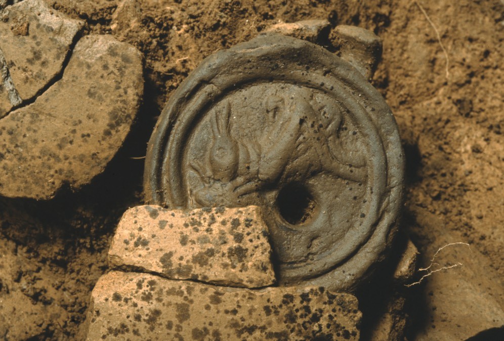 Cette lampe à huile importée des régions méridionales se caractérise par son médaillon à décor moulé représentant un criquet. Elle a été découverte en 1993 dans une fosse à incinération de la nécropole de Bibracte, mise au jour lors des fouilles menées à partir de 1992 pour aménager le parking du musée. Cette nécropole est utilisée de la fin du IIe siècle avant notre ère jusqu’au changement d’ère (comme en témoigne cette lampe datée de la fin de la période augustéenne), soit durant toute la période de fonctionnement de l’oppidum. Elle est située au pied du mont Beuvray, en dehors de l’oppidum, donc à l’écart du monde des vivants, mais au carrefour de plusieurs voies importantes.