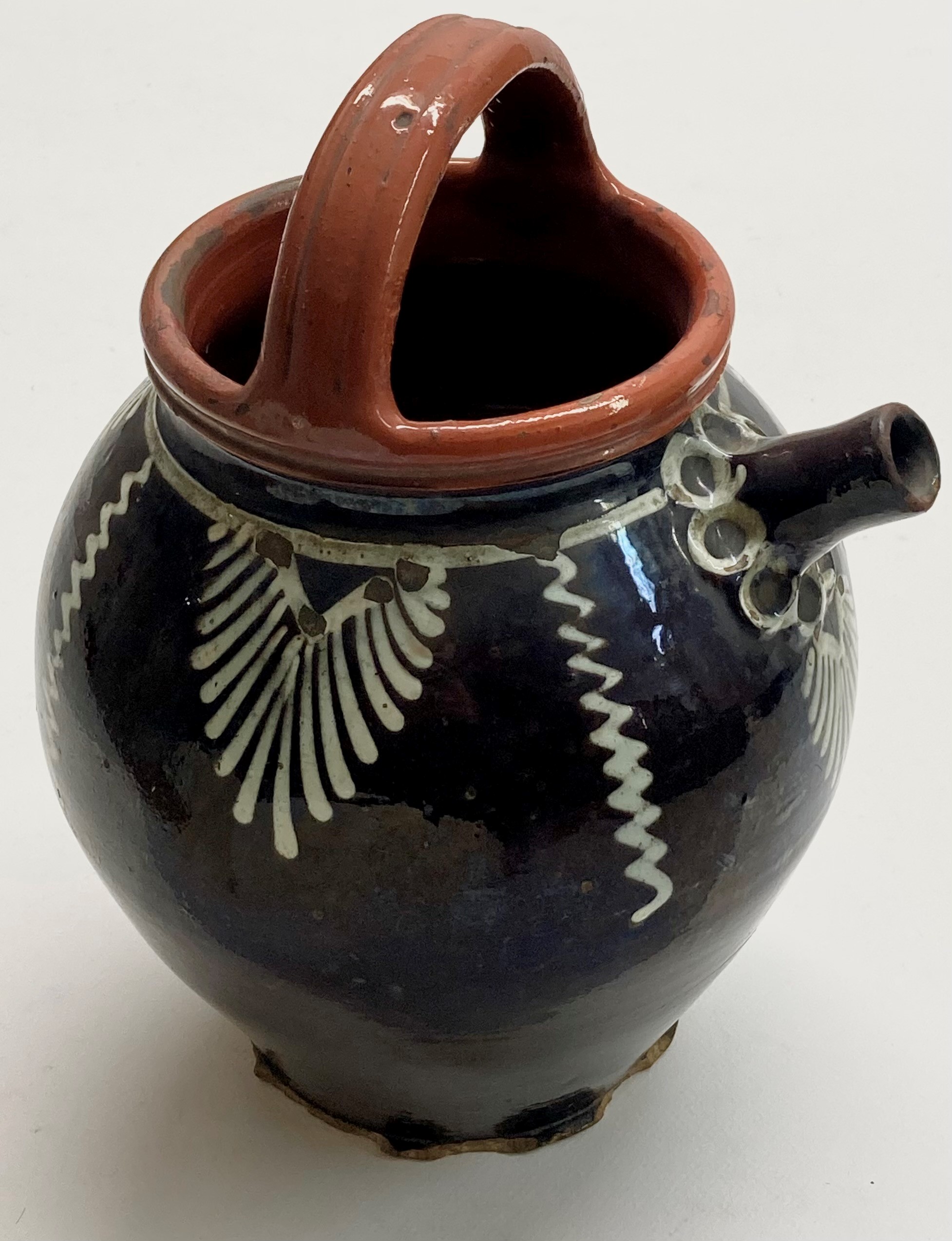 La cruche dont il est question, possède un goulot avec une anse qui lui est parallèle. L’objet sert en effet à boire et non à verser. L’axe de l’anse permet une facilité de préhension, l’autre main soutenant la base de la cruche. Ces « pots à boire » étaient utilisées lors du travail du sol, dans les champs ou dans les vignes, c’est pourquoi nombre de famille en possède encore, dans leur maison. Cet objet commun, du quotidien, n’en été pas moins travaillé, avec des motifs géométriques ou végétaux, et des couleurs variables (rouge, noir, violet, blanc, brun, jaune, etc.), réalisés grâce à des glaçures de divers oxydes métalliques.
