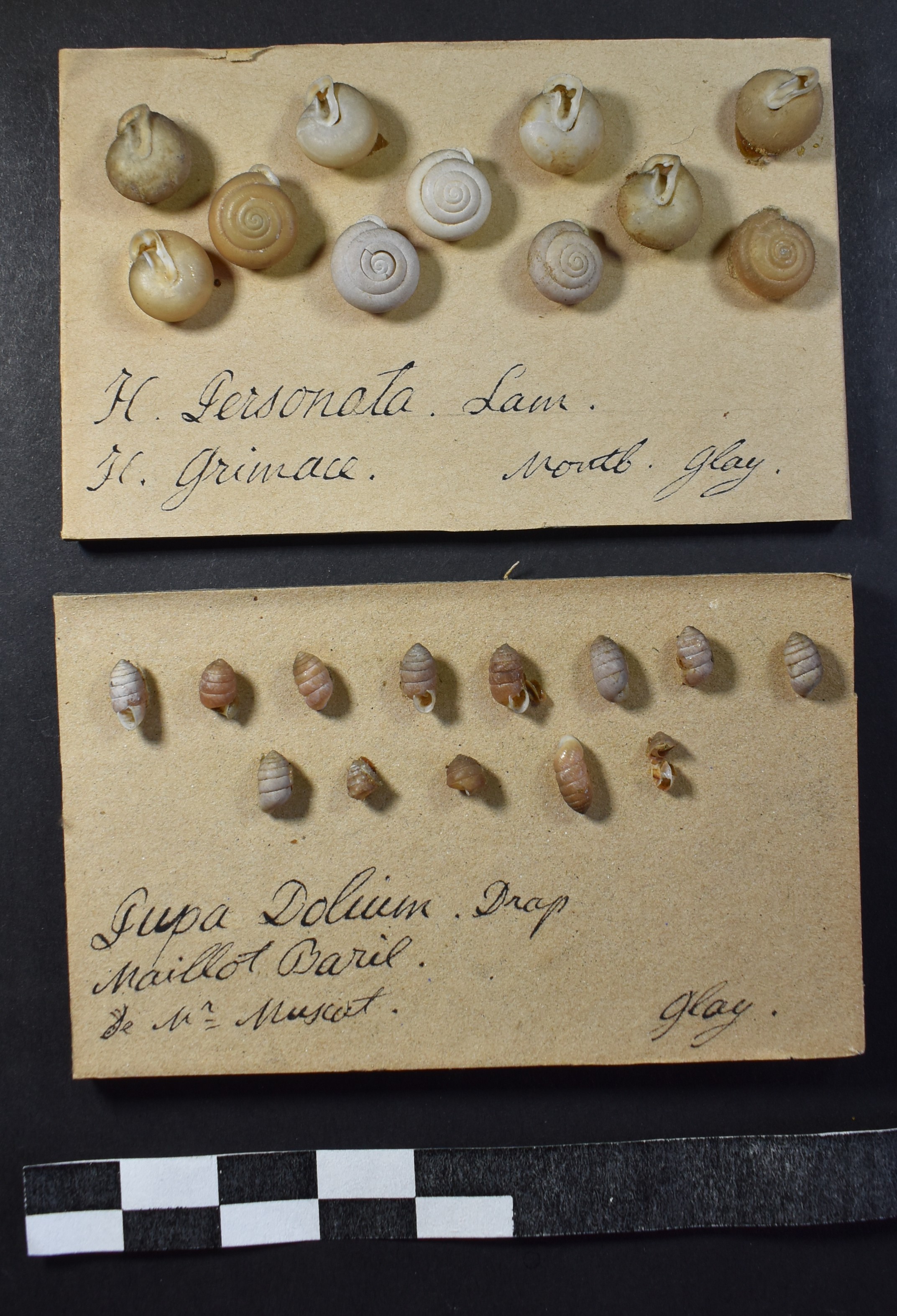 Ces spécimens proviennent d’une collection malacologique constituée dans l’arrondissement de Montbéliard au XIXe siècle. Les maillots barils, Orcula dolium (Draparnaud, 1801), vivent généralement dans la litière, sous la mousse dans les bois, parmi les rochers, à moyenne et haute altitude. L’Est de la France (Jura et Alpes) constitue la limite occidentale de leur aire de répartition. Les hélices grimaces, Isognomostoma isognomostomos (Schröter, 1784), répandus dans la région, vivent dans les forêts de pente humide, à moyenne ou haute altitude.