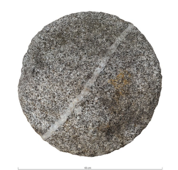 Cette meule inachevée a été prélevée dans les anciennes carrières du Bois de Joux, en Côte d’Or, vaste zone d’exploitation de vaugnérite pour la fabrication de meules rotatives située à 70 km au nord de Bibracte. La vaugnérite est une pierre abrasive de la famille des roches plutoniques à structure grenue mais pétrographiquement et chimiquement bien différente des granites. Elle est bien reconnaissable à l’œil nu par sa richesse en mica noir. Site meulier important à l’échelle de la Gaule, le Bois de Joux a livré de nombreuses ébauches de meules, correspondant à des ratés de taille, qui ont été prélevés par les habitants de la commune de Saint-Andeux tandis que d’autre sont toujours visibles dans les talus de la carrière.