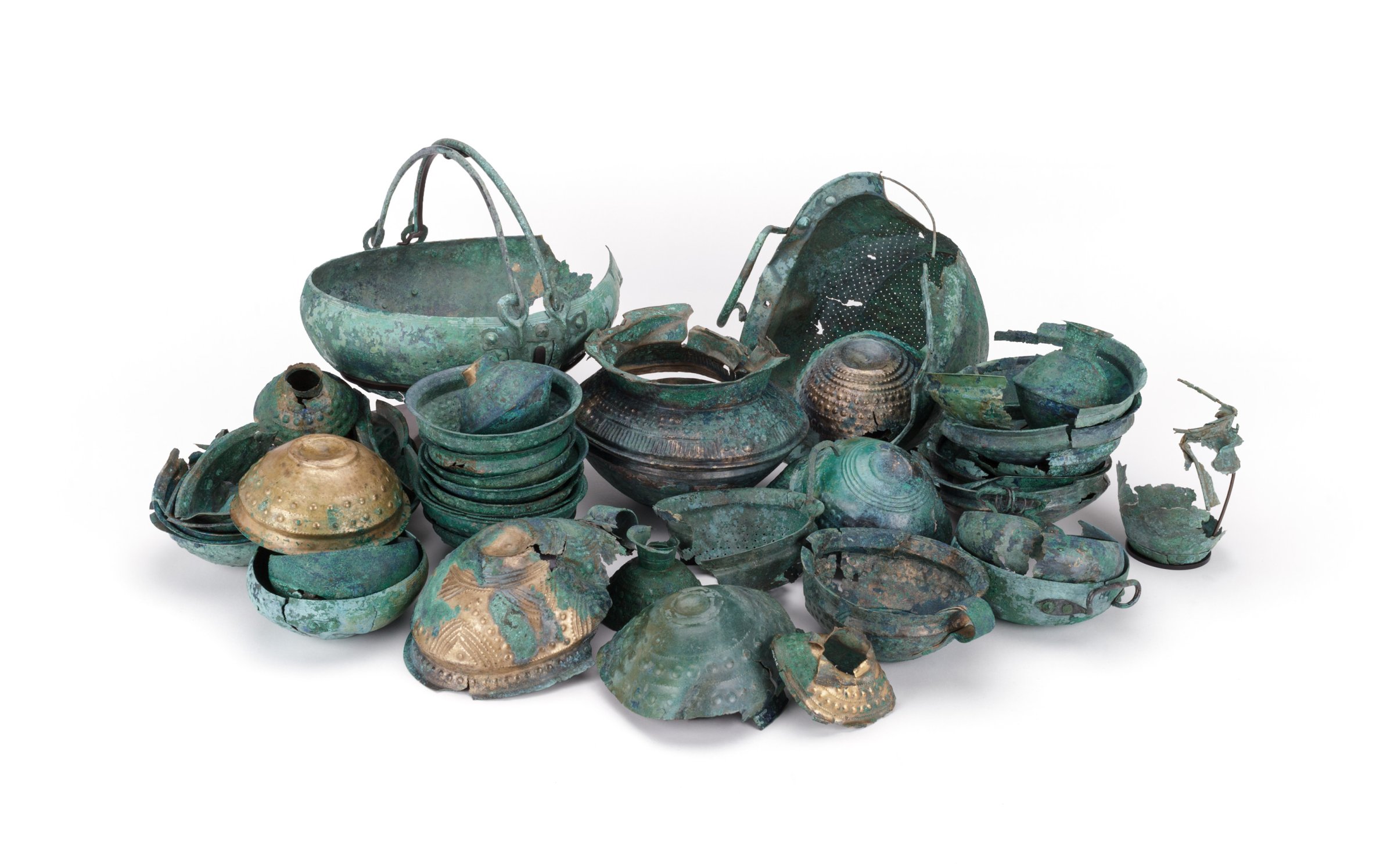 Il comprend tout d’abord un grand chaudron muni de deux anses provenant de la région des Carpathes, un vase biconique, un pichet-situle malheureusement très endommagé, une grande passoire pour laquelle les rares comparaisons sont à chercher en Hongrie ou au Danemark, ainsi qu’une passoire plus petite qui pourrait être de fabrication locale. Quatre chaudrons miniatures dont deux sont encore munis d’une anse. La catégorie la plus importante (trente-sept exemplaires) est celle des tasses et des coupes dont certaines ont pu être fabriquées localement, tandis que d’autres proviennent de régions plus à l’Est. Enfin, l’ensemble est complété par six petites fioles.