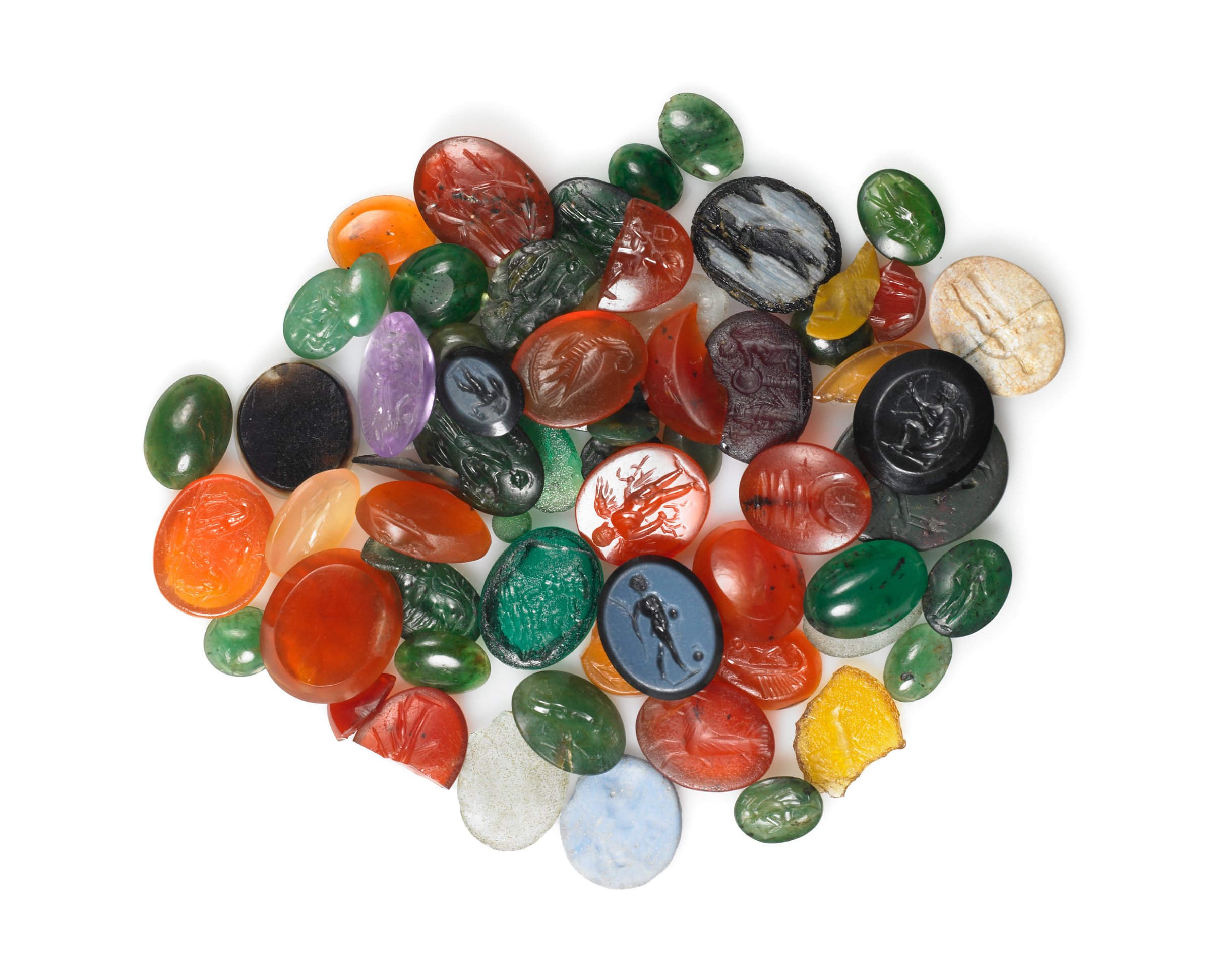 Cet ensemble exceptionnel comprend des pierres fines translucides : prase, améthyste et cornaline, mais aussi quelques pierres opaques : nicolo et jaspes. Quelques exemplaires en verre sont également présents.