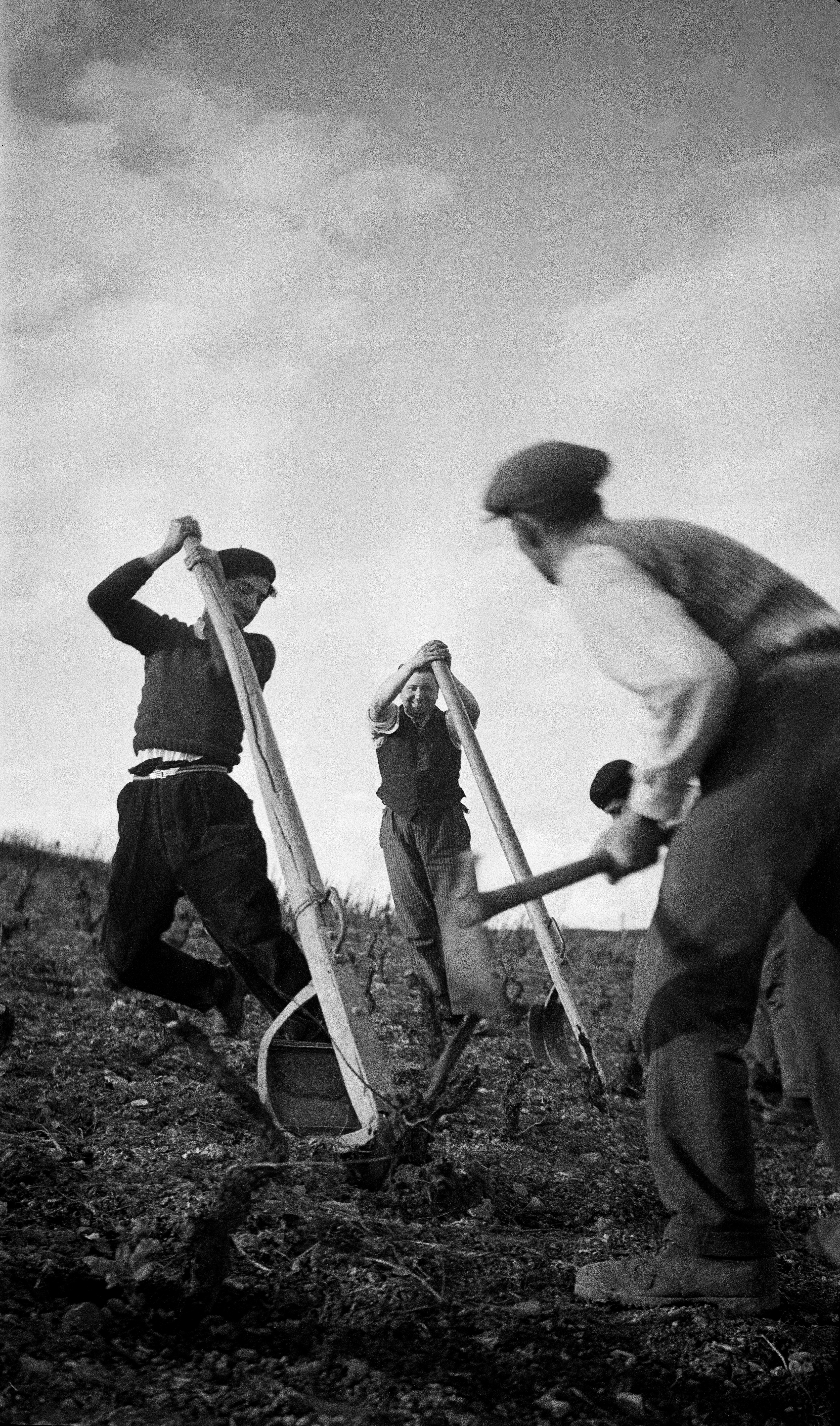 Une fois les vendanges terminées, les vignerons arrachent les ceps morts ou ceux à remplacer. Avant de repiquer un jeune plant, l’ancien pied de vigne et ses racines sont ôtés à l’aide d’un tire-cep, les cailloux enlevés et le trou approfondi. Cette photographie rend bien compte, dans une composition travaillée, du travail minutieux et exigeant que cette opération représente.