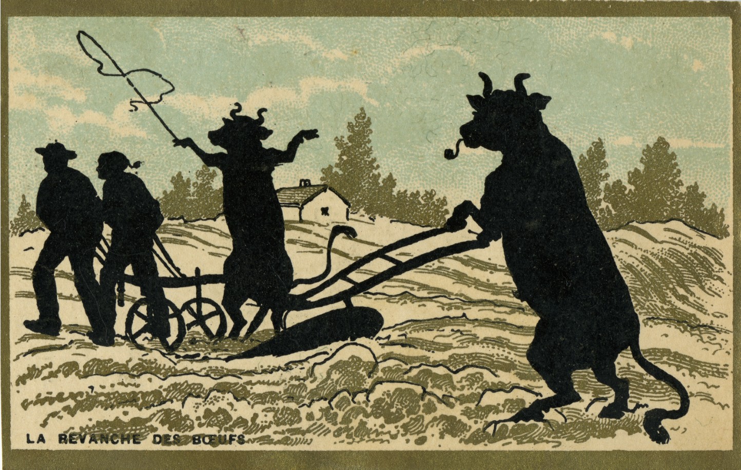 Cette image publicitaire pour l’horlogerie Peyron-Castille (située rue Bossuet à Dijon, jusqu’en 1926) met en scène sur un ton humoristique « la revanche des bœufs ». Si cette imagerie n’a rien à voir avec l’horlogerie, elle fait partie d’une série d’images amusantes, distribuées en guise de publicité. Celles de l’horlogerie Peyron-Castille forment une série sous forme de saynètes, avec des personnages en silhouettes noires, sur fond vert et gris. Les thématiques sont très diverses : montreur d’ours, combat d’épées, course à pied… Ici, l’amusement repose sur l’inversion : deux bœufs, debout sur leurs pattes arrières, prennent la place de deux paysans qui se retrouvent attelés à la charrue. L’un des bœufs fume la pipe en tenant la charrue, tandis que l’autre fait le cocher. Le titre donné à cette image interroge : la « revanche » sous-entend un traitement injuste, auquel l’inversion vient donner réparation.