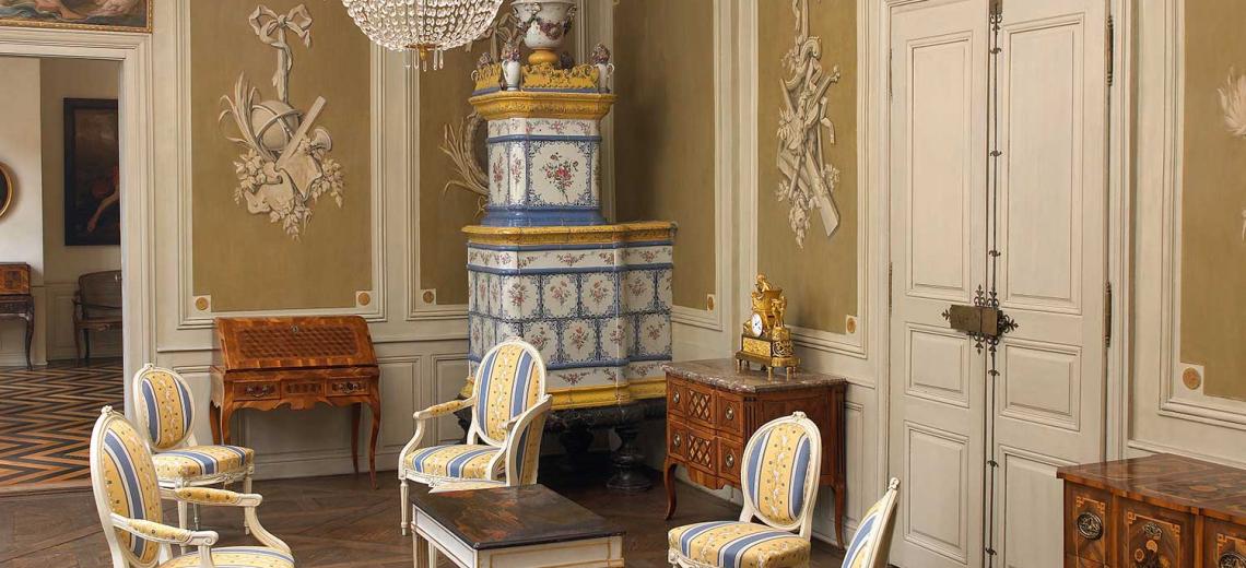 The first floor displays a bourgeois living room, adorned with portraits of family members and famous persons, furniture from the famous carpenter Abraham Nicolas Couleru, chairs, armchairs and sofas in Louis-quinze and Louis-seize style as well as the complete library of a scholar from the age of Enlightenment.