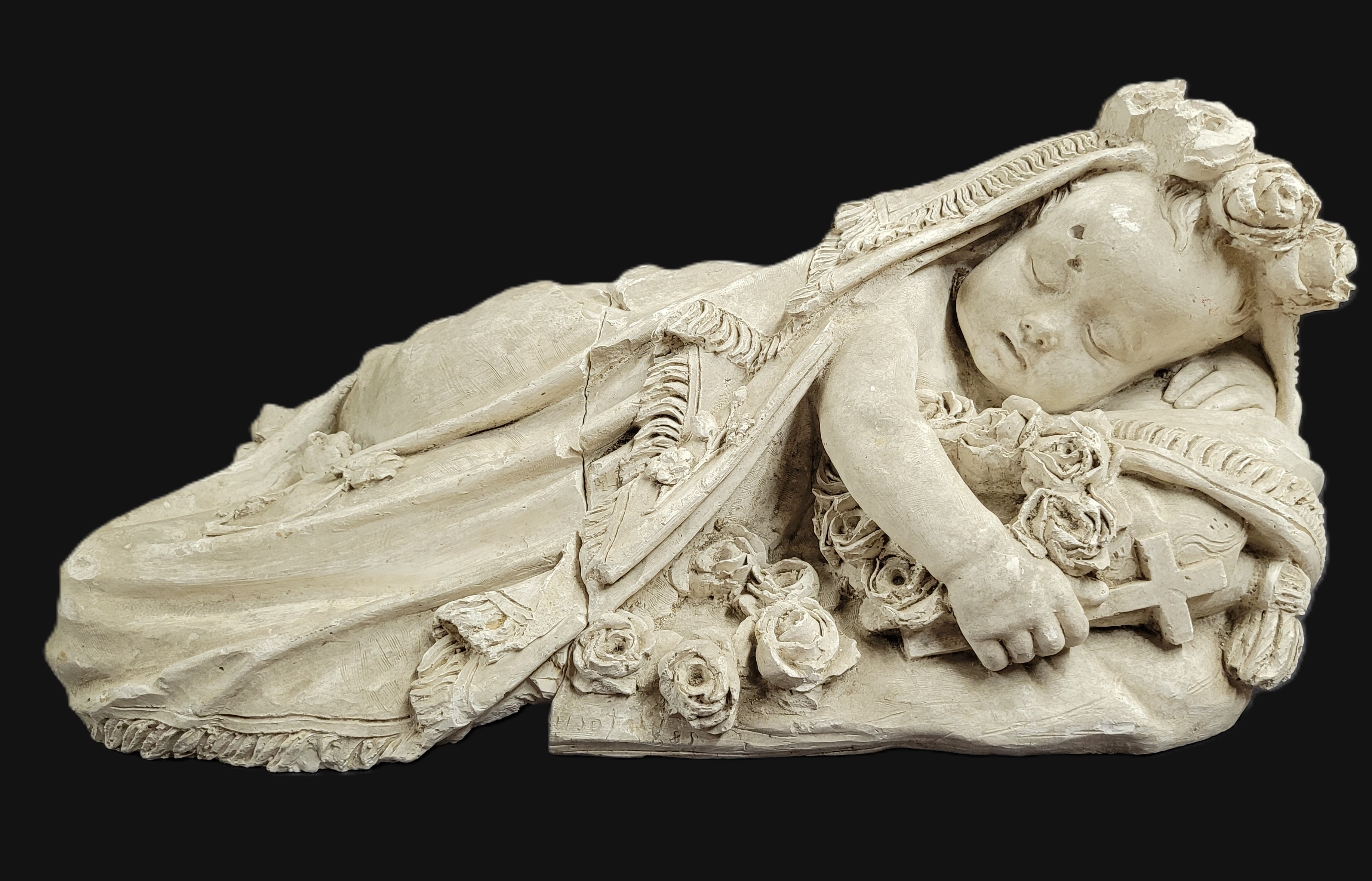 Ce plâtre a été réalisé par Frédéric CREUSOT (Semur-en-Auxois, 1832-1896), en 1889, et donné par l’artiste lui-même au musée de Semur-en-Auxois, en 1899. L’œuvre est signée « …usot 1889 », correspondant au nom de l’artiste et à la date de création. Dans un assez mauvais état et brisé en deux, ce plâtre est sur le modèle du monument funéraire d’un jeune enfant. Les yeux clos, l’enfant est couché paisiblement, la tête reposant sur un coussin et le corps recouvert par une couverture brodée. Il tient dans sa main droite une croix chrétienne. Des roses sont de part et d’autre de son bras et forment une couronne sur sa tête.
