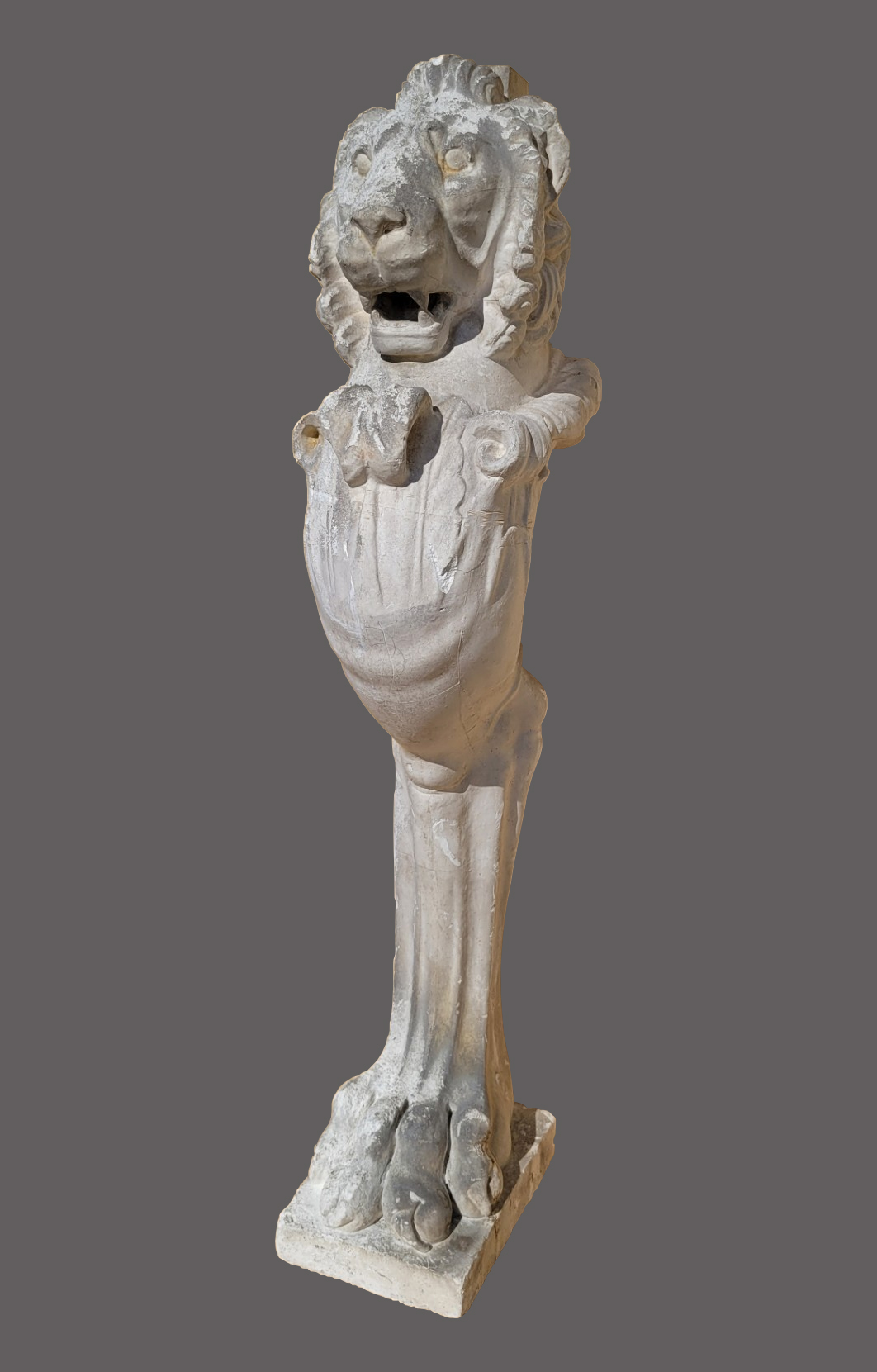 Ce trapézophore représente une tête de lion reposant sur une patte. L’original, en marbre, daté entre les Ier et IIe siècles ap. J.-C., provient des collections d’antiques de l’École Nationale des Beaux-Arts de Paris. Plus précisément, ce pied de table voit une tête de lion à la gueule légèrement entrouverte émerger au-dessus de feuilles d’acanthe. C’est sa patte griffue qui, soutenant l’ensemble en se posant sur une base quadrangulaire, semble se métamorphoser en corbeille sur son extrémité supérieure pour y accueillir les feuilles d’acanthe.