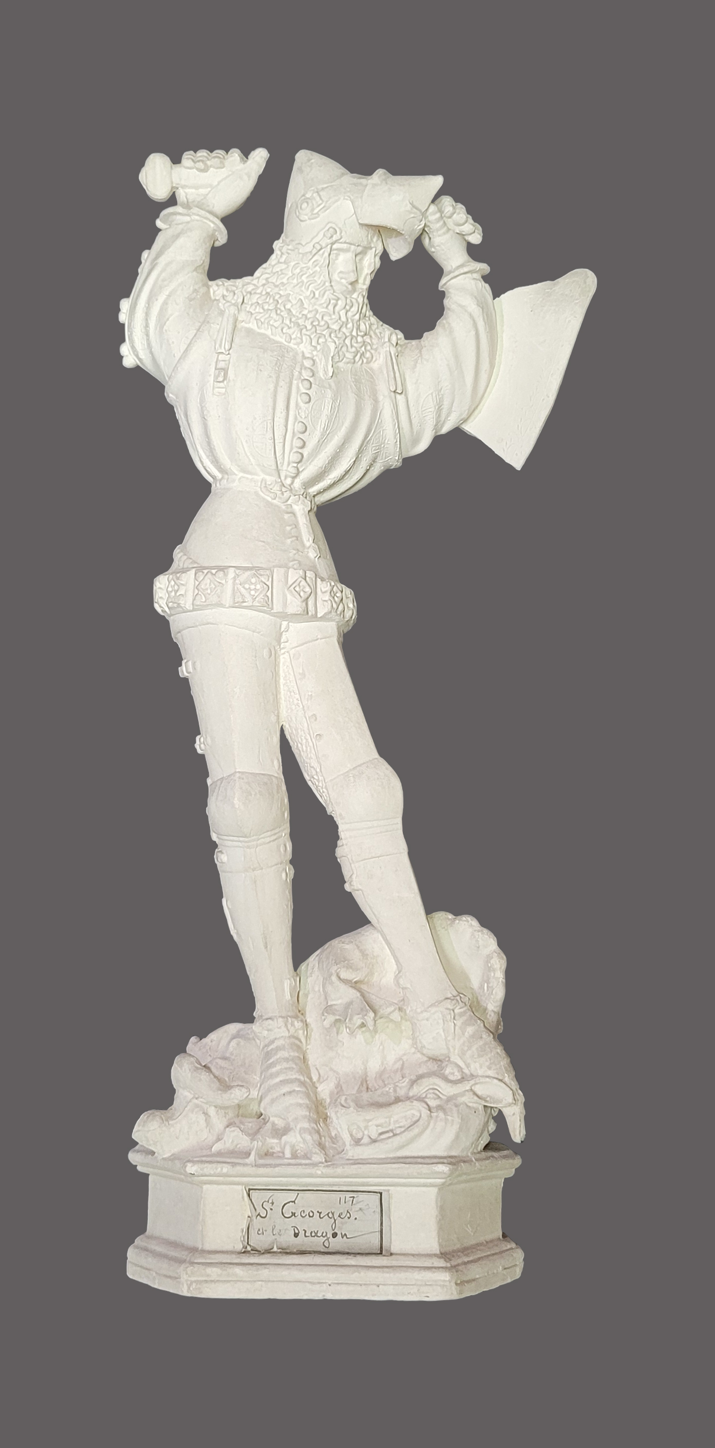 Cette statuette représente Saint-Georges terrassant un dragon, comme le veut la légende dans laquelle le saint apprivoise puis tue le dragon qui demandait des sacrifices humains. Il sauve alors la princesse qui devait être donnée en sacrifice. Cette statuette est tirée du retable de la Crucifixion réalisé par Jacques de BAERZE, retable commandé en 1390 pour la chartreuse de Champmol et installé en 1399. Il est aujourd’hui conservé au musée des Beaux-Arts de Dijon. Saint-Georges est représenté vêtu d’une armure, les bras levés brandissant une épée et un bouclier pour terrasser le dragon. L’état du plâtre est très dégradé et fragmentaire notamment au niveau des armes du saint.