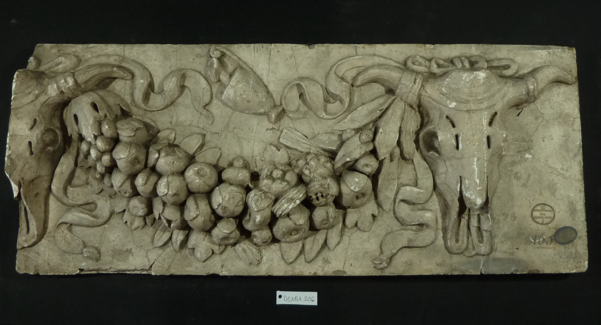 Ce bas-relief ornemental présente une guirlande de fruits sur trois niveaux. Celle-ci est entourée de part et d’autre de bucranes, des masques en forme de crânes de bovidés à cornes. Le bucrane de gauche est incomplet, laissant imaginer une continuité à cette guirlande dans le bas-relief d’origine. L’original, en marbre, est conservé au musée du Louvre. La datation de ce bas-relief n’est pas précisée, mais le motif ornemental permet de le rapprocher de la période romaine.