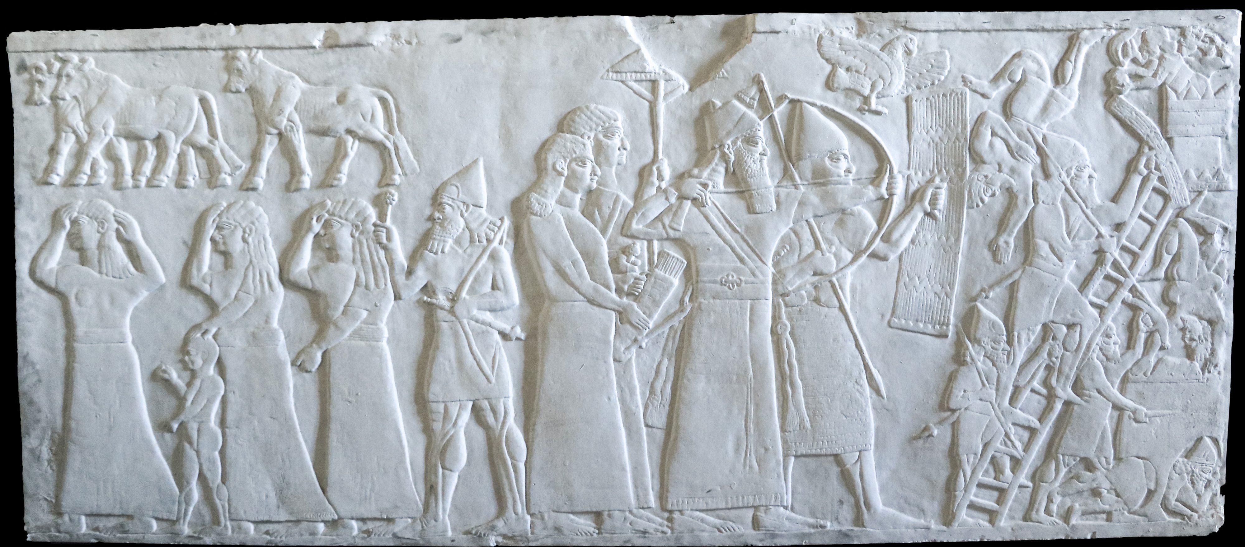Ce bas-relief représente le siège d’une cité mésopotamienne. L’original, en gypse, conservé au British Museum, à Londres, est daté vers 860 av. J.-C. Décorant initialement le palais royal de Kalkhu, ancienne capitale de l’Empire Assyrien à partir du règne d’Assurnasirpal II, ce bas-relief peint la vision des conquêtes militaires d’Assurnasirpal II. Il est représenté bandant son arc, prêt à décocher sa flèche vers une cité assiégée. Derrière, femmes, enfants et bétail faits prisonniers sont emportés. Ce plâtre ne reprend que la moitié gauche de la scène complète originale. Comme pour de nombreux autres plâtres de ce genre de collection, des attaches métalliques sont insérées dans la tranche supérieure afin de pouvoir le suspendre.