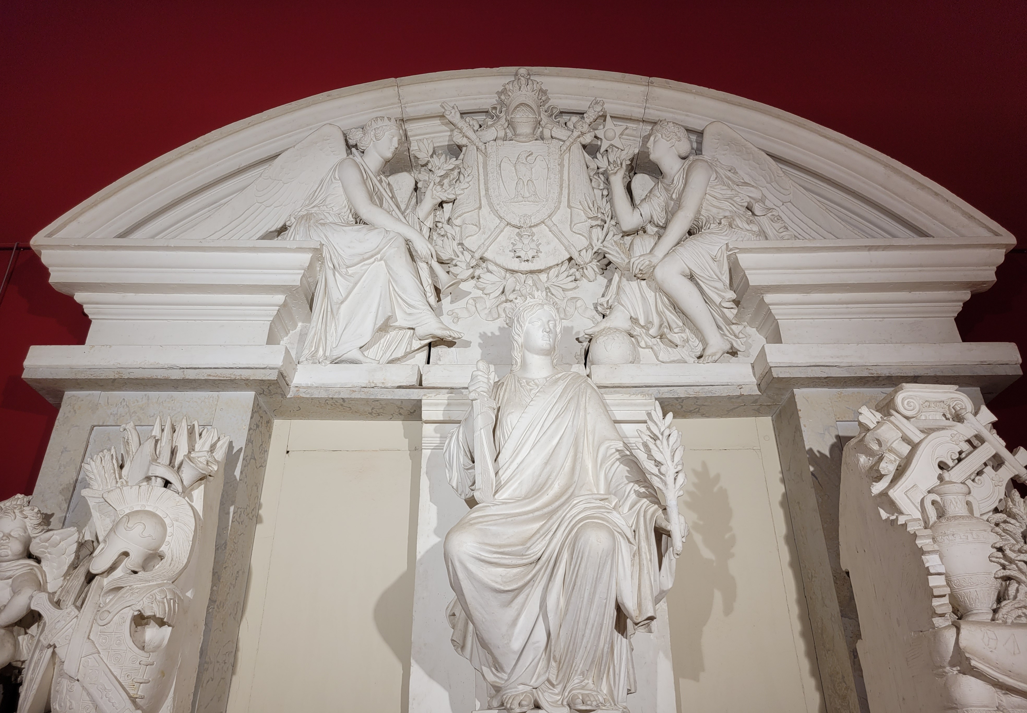 Ce plâtre, réalisé par Augustin DUMONT (Paris, 1801-1884) en 1854, est une maquette au tiers du fronton qui décorait le pavillon de Lesdiguières du Palais du Louvre à Paris, presque entièrement détruit en 1860 lors de la deuxième campagne de travaux du musée. Faisant originellement partie d’un ensemble plus grand, deux figures ailées y sont représentées, de part et d’autre du blason impérial, avec un aigle en son centre. La figure de gauche est assise, porte une couronne, et tient une couronne de lauriers et une longue trompette. Celle de droite est également assise, un pied posé sur un globe terrestre, et tient une branche de palme.