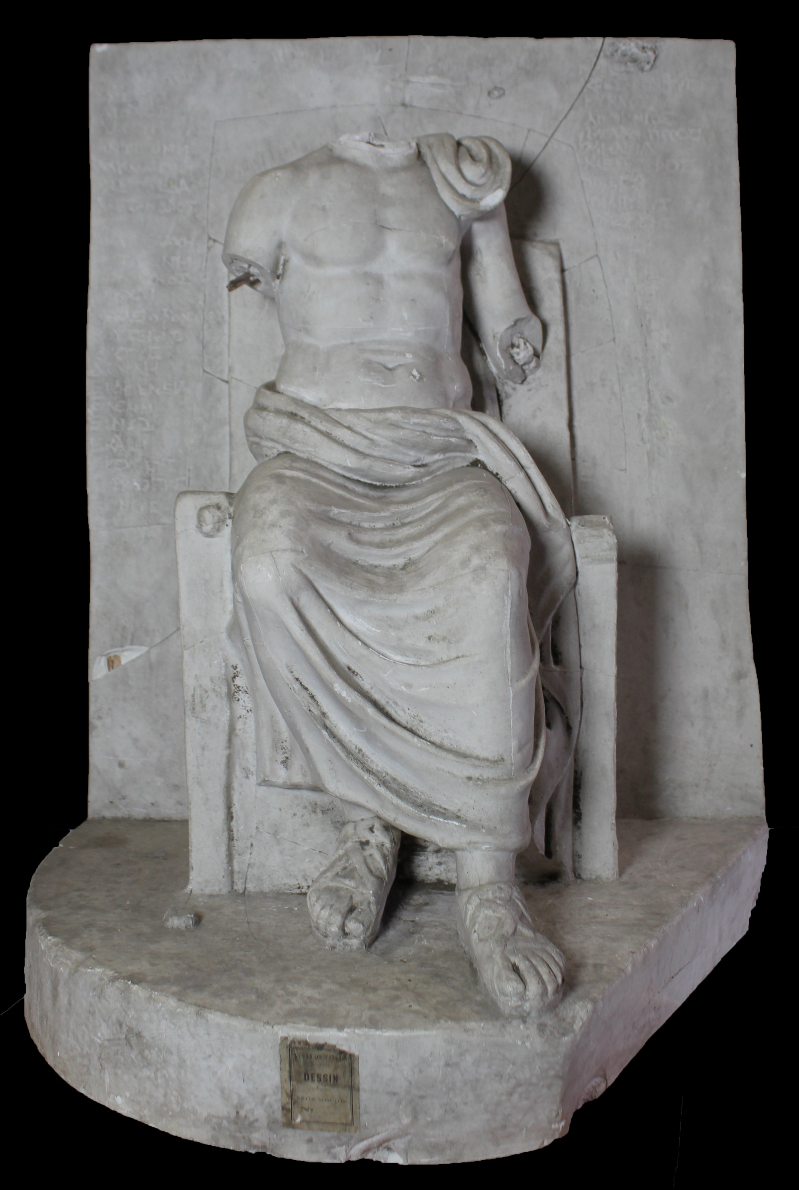 Ce plâtre représente une figure masculine drapée, assise sur un trône adossé contre un mur. L’homme est identifié comme l’auteur de tragédies grecques Euripide, malgré sa tête manquante. L’original, en marbre, daté du IIe siècle ap. J.-C., dont la tête a été restaurée, est conservé au musée du Louvre, à Paris. Une étiquette sur la base du plâtre indique « LYCÉE DE VESOUL / DESSIN / Série unique / N°. ». Cette étiquette montre que les collections didactiques faisaient l’objet d’inventaires dans les établissements d’enseignement, ici le lycée Gérôme de Vesoul.