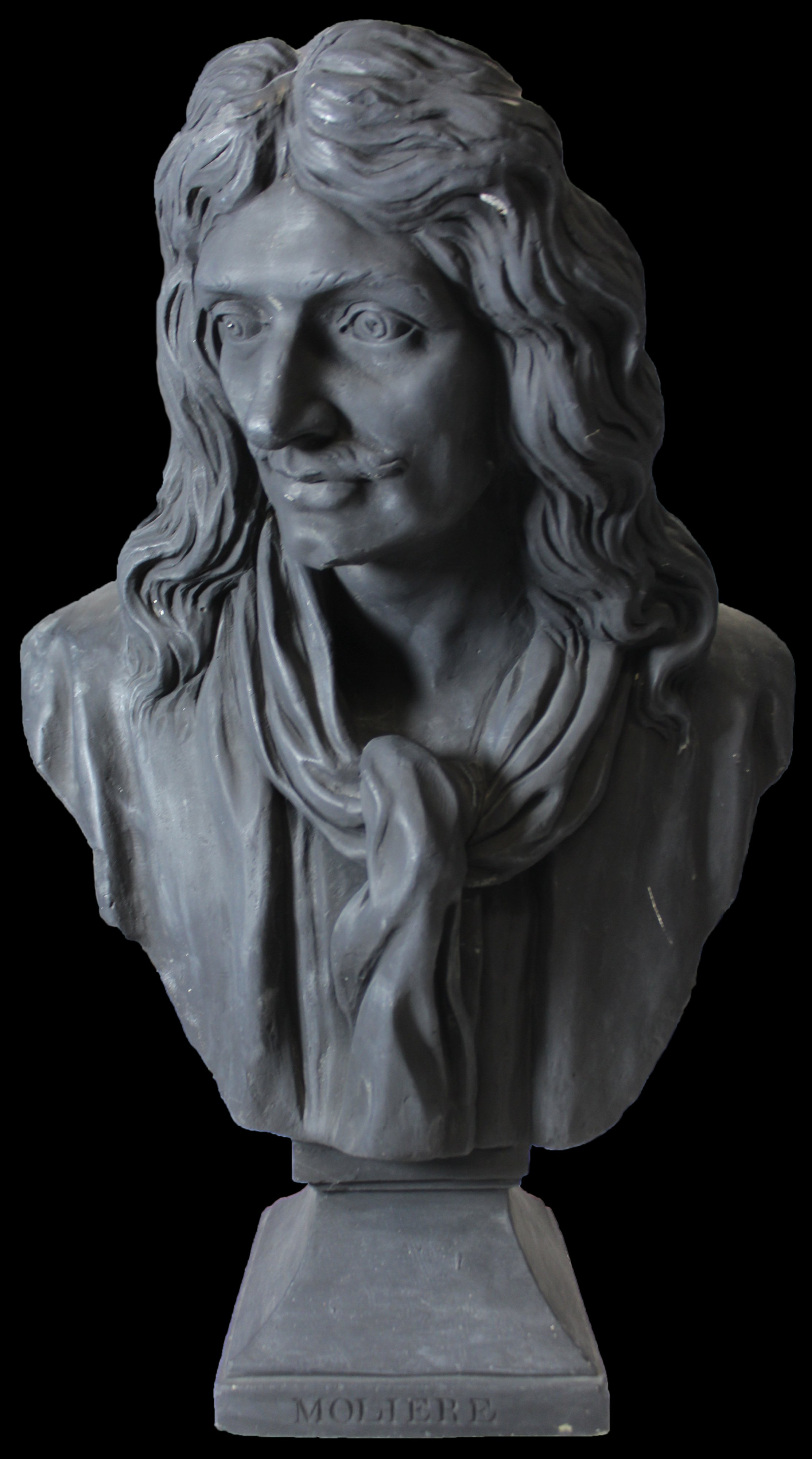 Ce buste en ronde-bosse représente un homme moustachu aux longs cheveux coiffés d’un bonnet. Il porte autour de son cou un foulard noué. Il est visuellement identifiable comme Jean-Baptiste POQUELIN, plus connu sous le nom de Molière. La gravure « MOLIERE », sur le socle, confirme cette identification. Le buste, en très bon état, ne présente qu’un petit éclat au niveau du menton. La couleur noire, rappelant celle d’un bronze oxydé, est due à l’application d’une patine, puis d’une reteinte plus tardive à l’encre et à la gouache diluée.