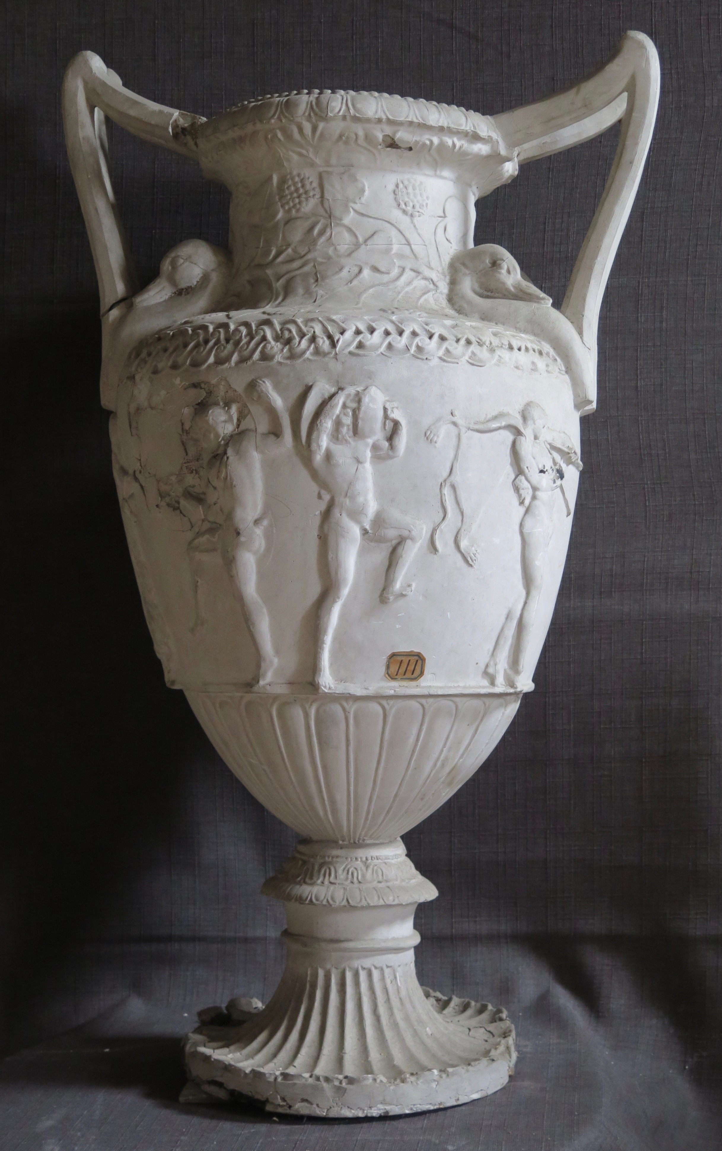Structurellement, il est possible que des armatures métalliques aient été insérées dans les anses en plâtre pour rendre l’ensemble plus solide, et ainsi pouvoir peut-être soulever le vase naturellement par ses anses. Cette technique est bien attestée pour d’autres plâtres, notamment dans les doigts des statues.
