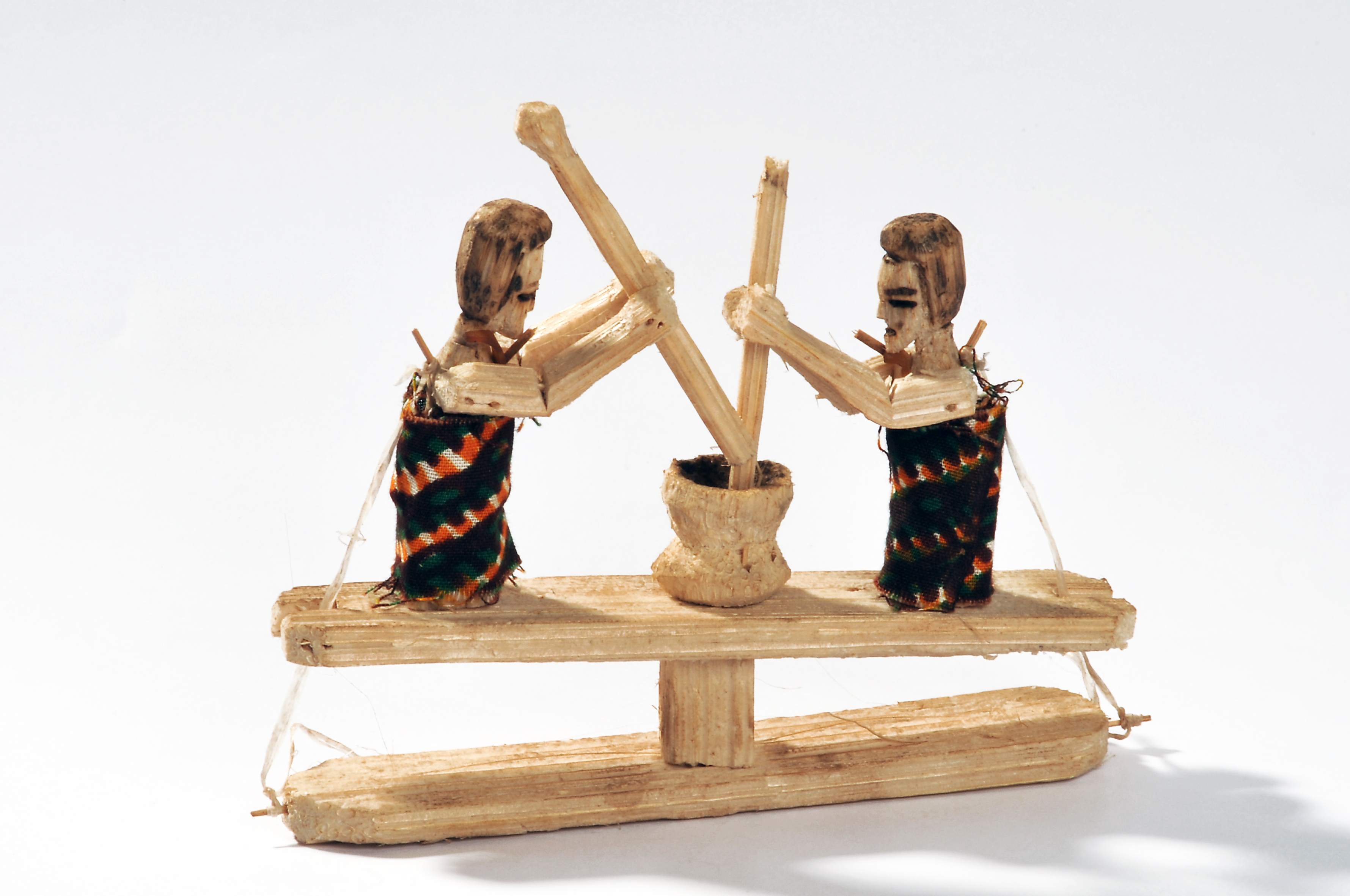 Ce petit groupe articulé représente deux pileuses en action. Il a été fabriqué en 1983 République d’Afrique centrale par un enfant dont l’inventaire précise que c’est un garçon, âgé de 12 à 14 ans. Cette information est relevée par Chantal Lombard (1941-1991) qui a très probablement collecté elle-même ce jouet en bois. Cette ethnologue a consacré ses travaux aux jeux et jouets d’enfants du monde. Elle publie dans les années 1970 un livre dédié aux jouets d’enfants baoulé, un autre aux céramiques miniatures provençales destinées aux enfants. Chantal Lombard avait rassemblé une collection de plus de 700 objets, provenant d’une trentaine de pays. Elle a été donnée au musée par son légataire Richard C. Male en 2001. Parmi ces objets, un peu moins d’une centaine viennent du continent africain. Musée du Jouet, Moirans-en-Montagne