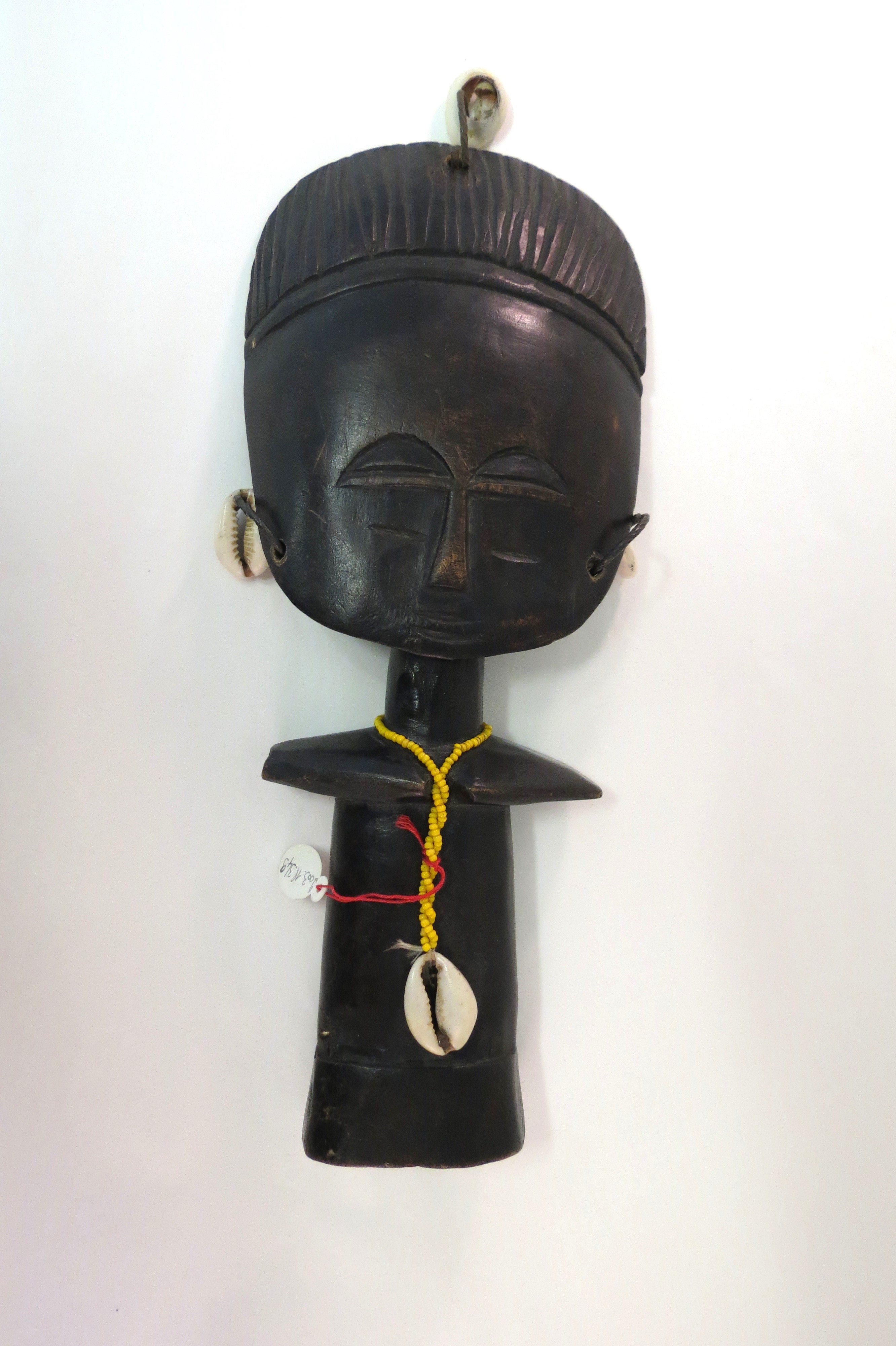 Malgré sa présence au musée du Jouet, cet objet n’en est pas un mais servait dans les rituels liés à la fécondité féminine en pays ashanti (notamment dans le Ghana actuel). Les statuettes akwaba étaient portées dans le dos par les femmes qui désiraient avoir des enfants ou celles qui, enceintes, souhaitaient que leur enfant à naître hérite de la beauté de ces objets. C’est pour cette raison qu’elles ont été considérées à tort comme des poupées. Avec leurs traits stylisés et leur tête ronde qui s’oppose à un corps schématisé, ce type d’objet plaît beaucoup aux collectionneurs occidentaux et sont également abondamment produites pour le marché, parfois en dehors de tout contexte rituel. Ces deux statuettes ont été acquises par Jean-Claude Baudot qui commence une collection de jouets et jeux anciens en 1962. L’ensemble avait été acquis en 1984 par la ville de Canet-en-Roussillon pour son musée du Père Noël, avant d’être vendu en 2003 au musée de Moirans-en-Montagne. Musée du Jouet, Moirans-en-Montagne
