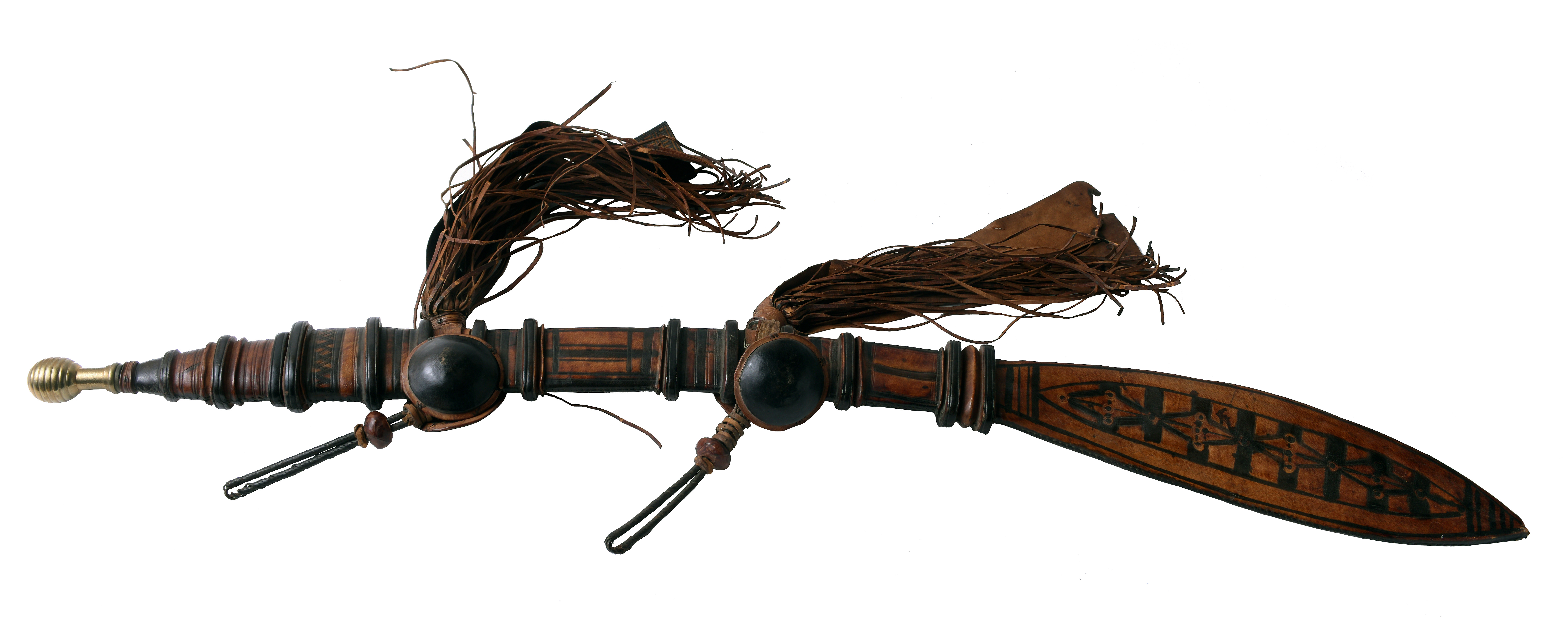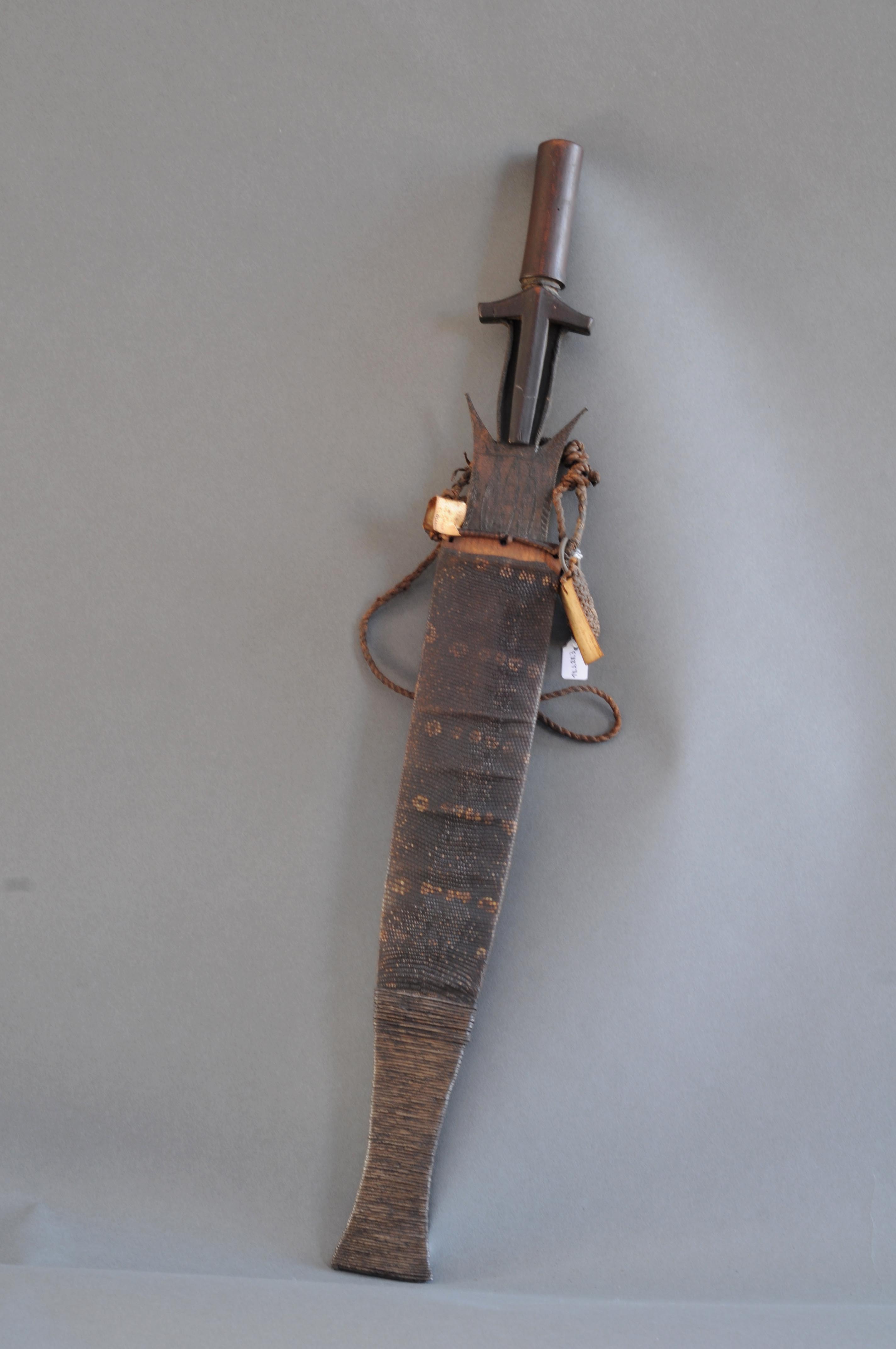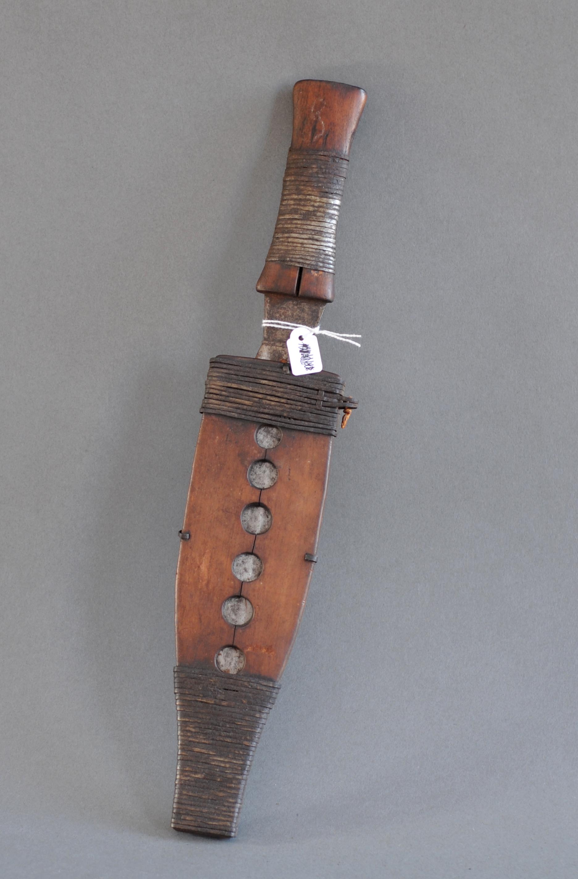 Parmi les objets donnés au musée de Sens en 1914 par la famille de Gustave Méry, trois couteaux ont été acquis au Gabon en 1866. L’un d’eux possède un manche en bois enroulé de fines lamelles de fer. Il est accompagné de son fourreau, orné de la même manière, et ajouré de plusieurs cercles. Peu d’informations sont connues sur Gustave Méry, qui était probablement un officier de marine. Il aurait acquis cet objet dans le contexte du trafic marchand de l’estuaire du Gabon, alors fréquenté au milieu du XIXe siècle par ces groupes dits alors « pahouins » pour désigner les populations fang du nord-ouest de l’actuel Gabon, servant d’intermédiaires entre les européens et les populations de l’intérieur pour le commerce. Musée municipal, Sens