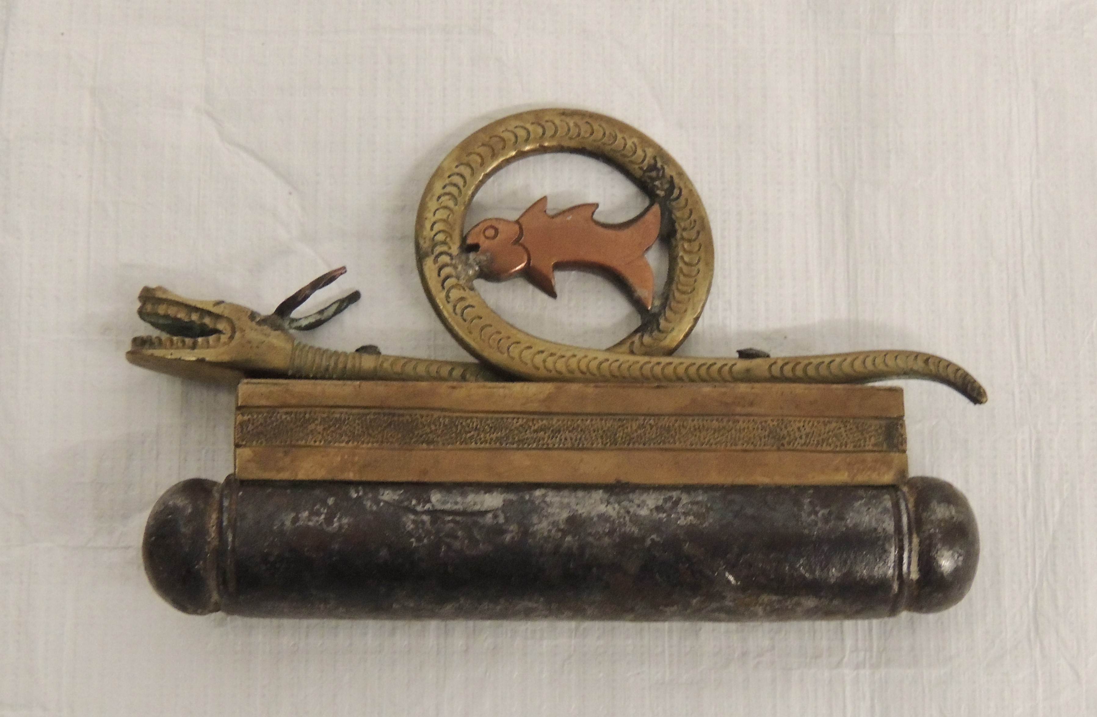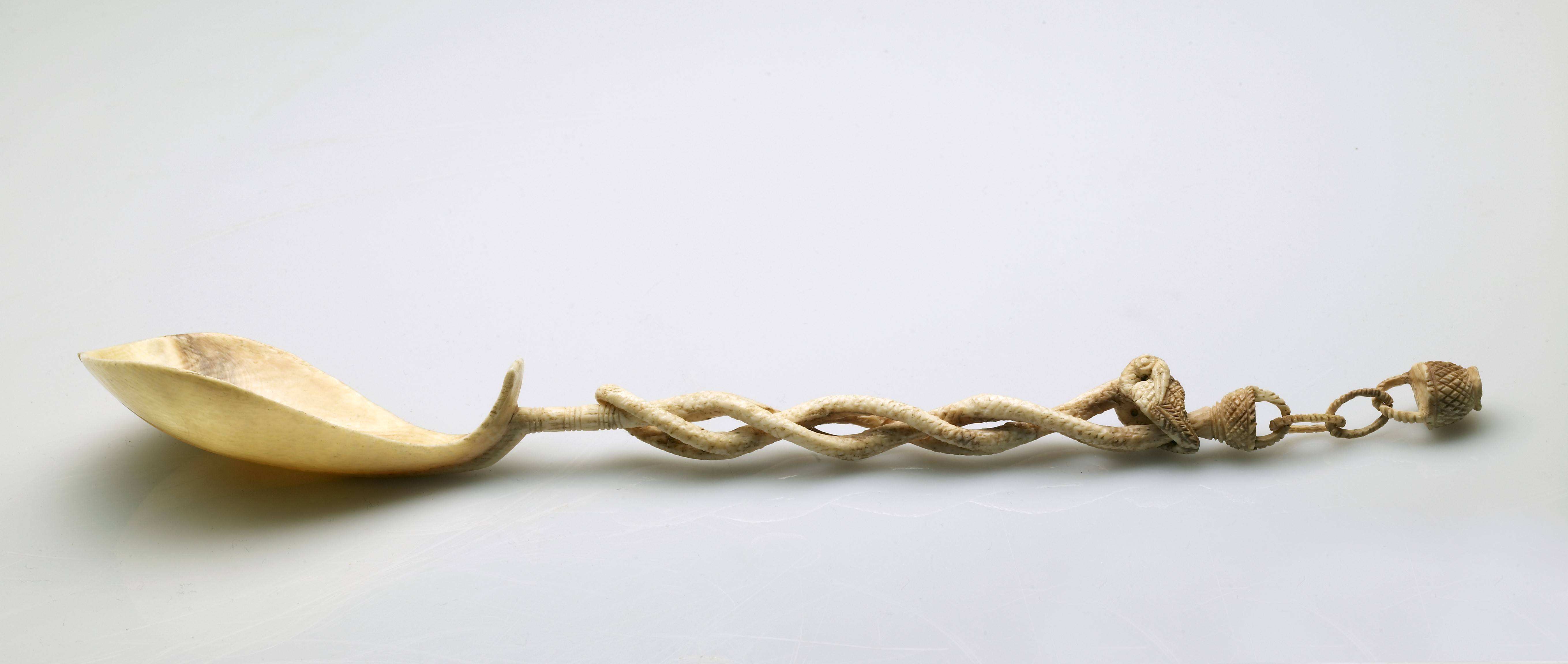 Nous connaissons effectivement bien, maintenant, les objets en ivoire sculptés d’une part dans le royaume de Bénin ou dans la cité-État d’Owo voisine (actuellement sur le territoire nigerian), fabriquées à l’usage des élites locales, parfois aussi commercialisés à destination de l’Europe. Cet cuiller appartient au premier ensemble. Un serpent sinue le long du manche et s’empare d’un oiseau à son extrémité. Là, un petit panier à l’ensemble est rattaché à l’ensemble par quelques anneaux. Musée des Beaux-Arts, Dijon