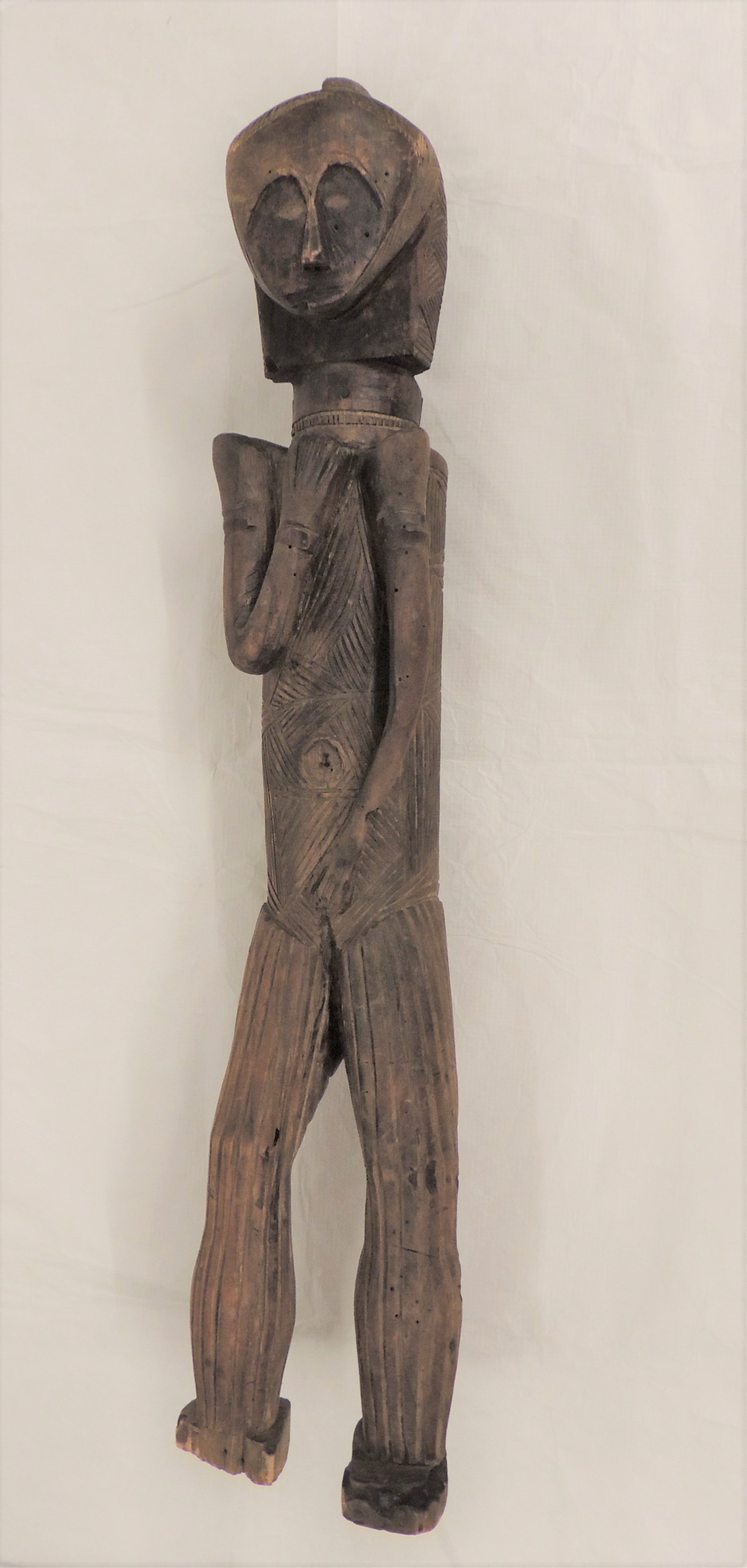 Membre de la Compagnie française du Haut-Congo, Henri Tréchot fait don de cette sculpture de bois au musée de Nevers lorsqu’il rentre en France en 1914. L’objet représente une figure féminine en pied. Certaines caractéristiques stylistiques, notamment le traitement des volumes, de la coiffe et le type de scarifications, s’apparentent à ce que l’on connaît de la statuaire classée comme fang du Gabon, plus tardive, et servant de gardienne à des reliquaires dans lesquels on trouve des ossements d’ancêtres. Il s’agirait alors de l’un des rares exemples de gardiens de reliquaires fang à entrer dans les collections avant la Première guerre mondiale, alors même qu’ils sont peu connus et pas encore recherchés. Henri Tréchot s’est procuré cet objet durant son activité commerciale, quand il gère avec plusieurs de ces frères de nombreuses factoreries le long du fleuve Congo depuis 1888. L’aire de diffusion du style fang étant située plus à l’Ouest, au Gabon, on peut imaginer qu’il l’ait acquise à l’occasion de déplacements, notamment vers Libreville, la capitale de la colonie. Musée de la Faïence et des Beaux-Arts Frédéric Blandin, Nevers