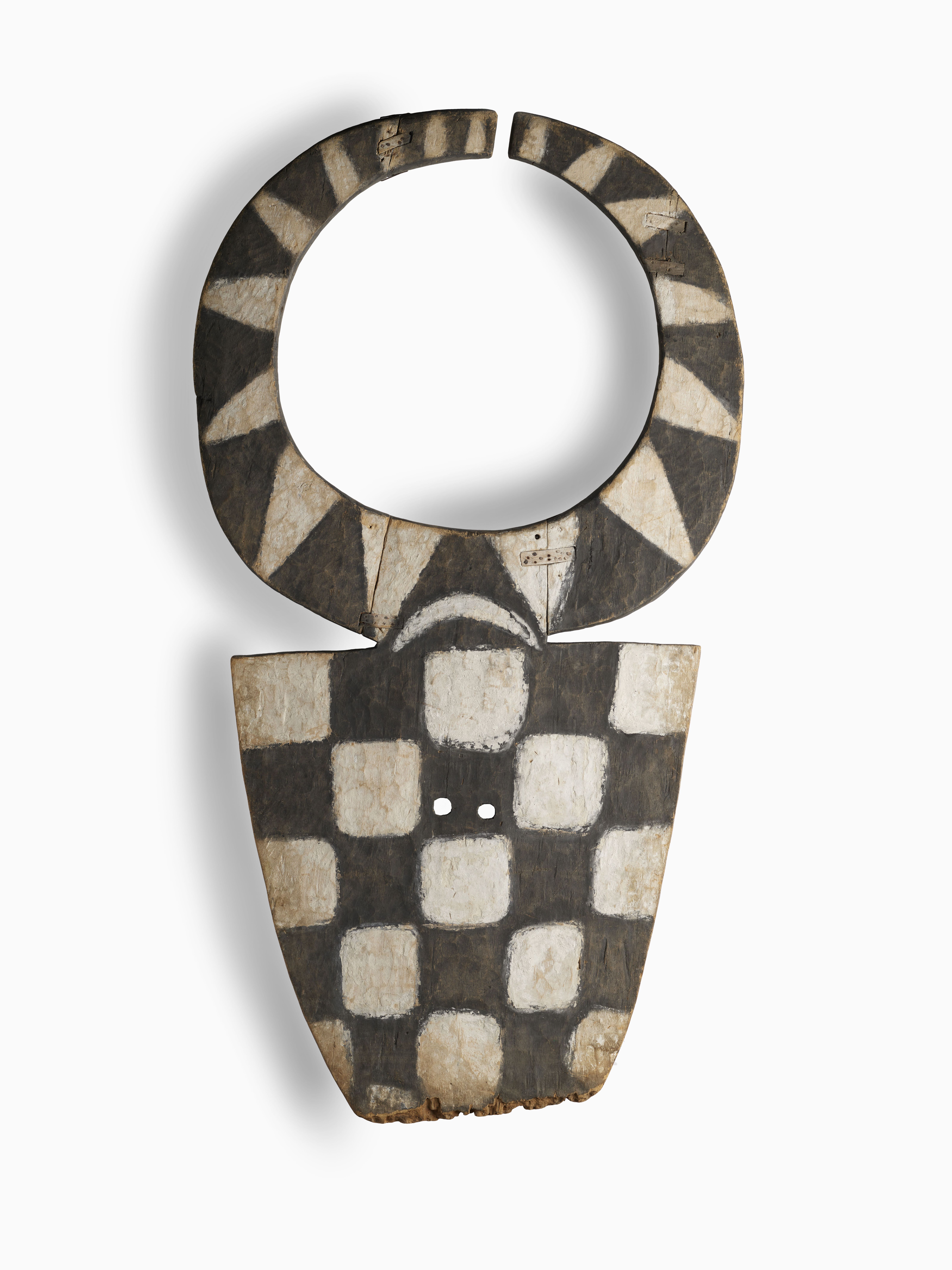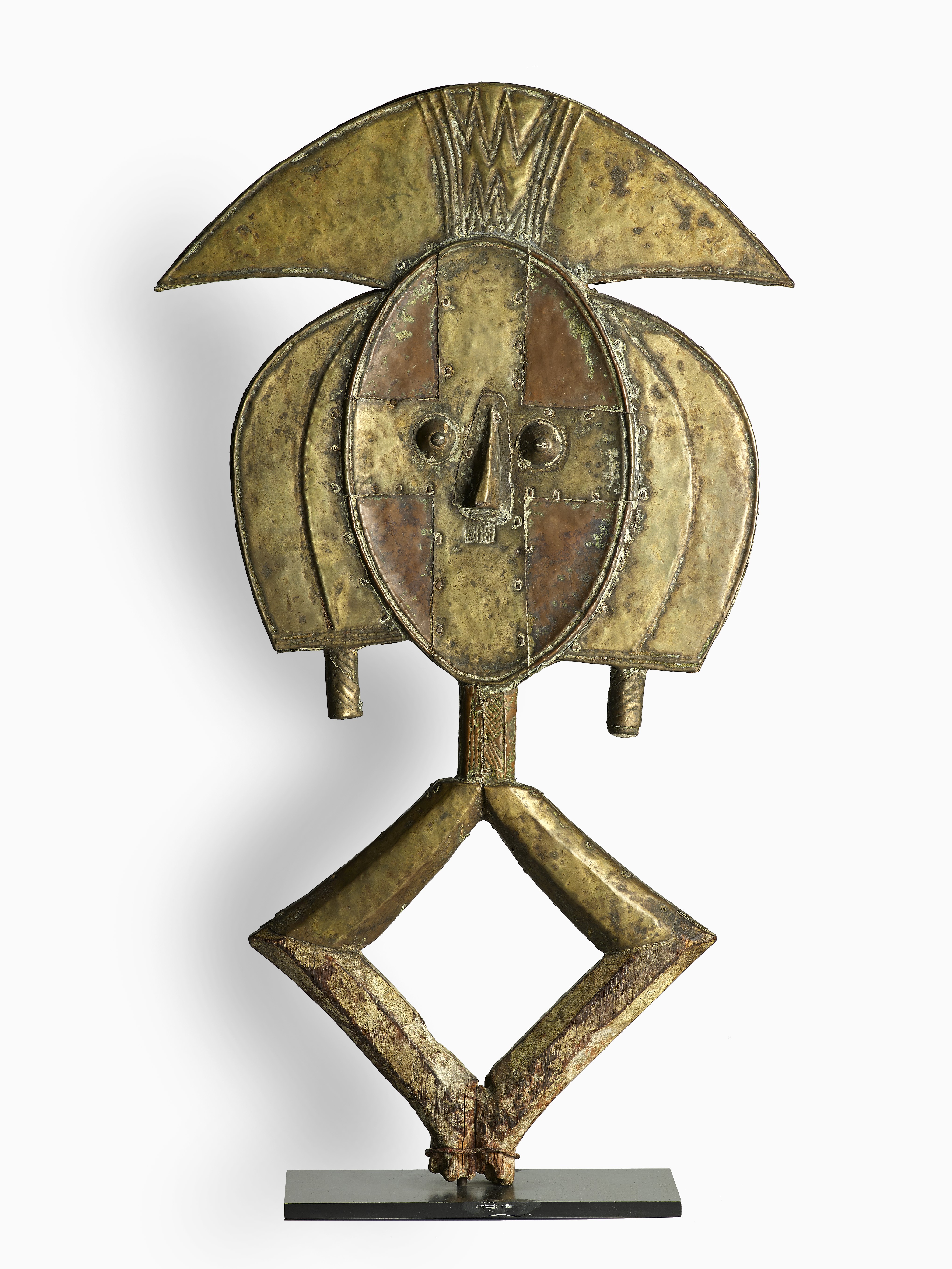 Acquise sur le marché de l’art par le couple de collectionneurs Pierre et Kathleen Granville, cette figure de reliquaire produite au Gabon a été donnée au musée des Beaux-Arts de Dijon en 1974, parmi de nombreux objets de leur collection. Sur une âme de bois, des feuilles de cuivre rouge et de laiton sont plaquées de façon à représenter un visage stylisé. L’objet renvoie à une fabrication dite kota-obamba destinée initialement à surplomber les boîtes qui conservent les ossements des ancêtres, dans le cadre de l’initiation du bwiti. D’abord introduites en France autour de 1880 lors des premières expéditions dans le Haut-Ogooué, en amont du fleuve, on retrouve ces figures dans les collections tout au long du XXe siècle, devenues l’une des pièces emblématiques du Gabon que les amateurs d’art n’auront de cesse de rechercher. Le couple Granville a sans doute acquis l’objet par le biais d’un autre collectionneur ou marchand d’art à Paris. Se refusant à démembrer sa collection, il en fait don avec d’autres pièces africaines, dont certaines proviennent aussi d’Afrique équatoriale. Musée des Beaux-Arts, Dijon