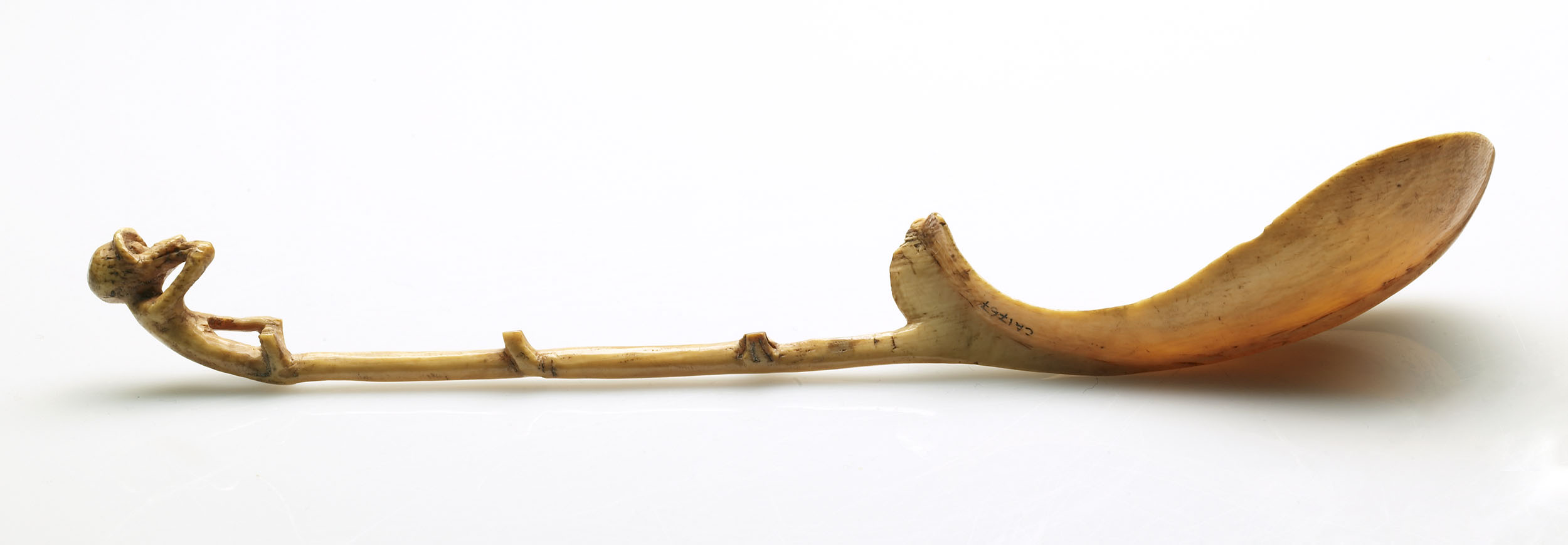 Tout d’abord à Dijon, capitale des États de Bourgogne. Là, Jean-Baptiste Jehannin de Champblanc, conseiller au Parlement, rassemble une collection encyclopédique à partir des années 1750. À la Revolution, ses biens sont saisis et rejoignent les collections de la ville. Jehannin de Chamblanc avait constitué un « cabinet chinois » et c’est certainement de celui-ci que proviennent les quelques « cuillers de fabriques indienne et chinoise », que décrit le catalogue du musée des Beaux-Arts en 1834. Il précise que « deux de ces cuillers, faites d’ivoire, ont des manches très-ouvragés ». Il faut attendre 2008 pour que l’on se rende compte que ces cuillers proviennent en fait d’Afrique de l’Ouest. L’aileron dorsal de cette cuiller, comme l’attache recourbée du cuilleron au manche, formant un crochet à trois pointes, indiquerait une fabrication dans la cité-État d’Owo (actuellement sur le territoire du Nigeria), peut-être au XVIe siècle. À son extrémité, un singe tient un fruit dans ses pattes. Musée des Beaux-Arts, Dijon