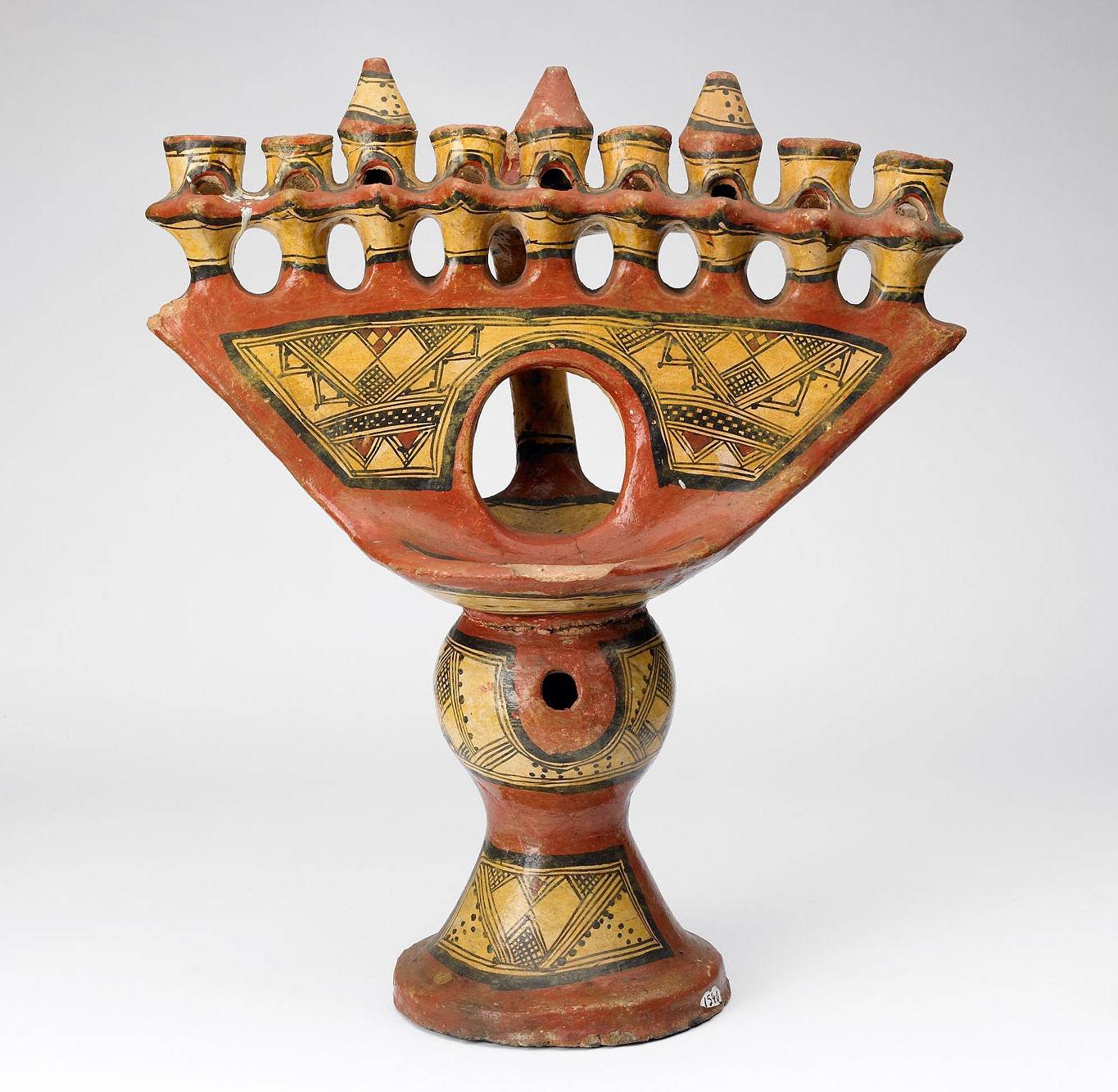 En 1875, c’est au musée de Poligny que le docteur Emile Louis Bertherand (1821-1890) offre cette lampe à huile. Après avoir débuté sa carrière à Lille, ce chirurgien militaire sert en Algérie entre 1847 et 1853. Il s’établit ensuite à Poligny jusqu’en 1863 puis retourne à Alger rejoindre ses frères où il exerce à nouveau la médecine. Membre fondateur de la Société d’Agriculture, sciences et arts de Poligny, il contribue, avec d’autres, à l’enrichissement des collections du musée de la ville, notamment par une collection de plusieurs céramiques de Kabylie. Artisanat féminin réalisé en terre cuite, modelé au colombin, les poteries de Grande Kabylie, région montagneuse et berbérophone d’Algérie, sont caractérisées par un engobe rouge et des motifs géométriques. Elles pprésentent un intérêt tout particulier pour les Français en voyage en Algérie entre la fin du XIXe et le milieu du XXe siècle. On en retrouve donc en grand nombre dans les collections françaises, décliné sous plusieurs formes : lampe, jarre, amphore, pot... Musée municipal, Poligny