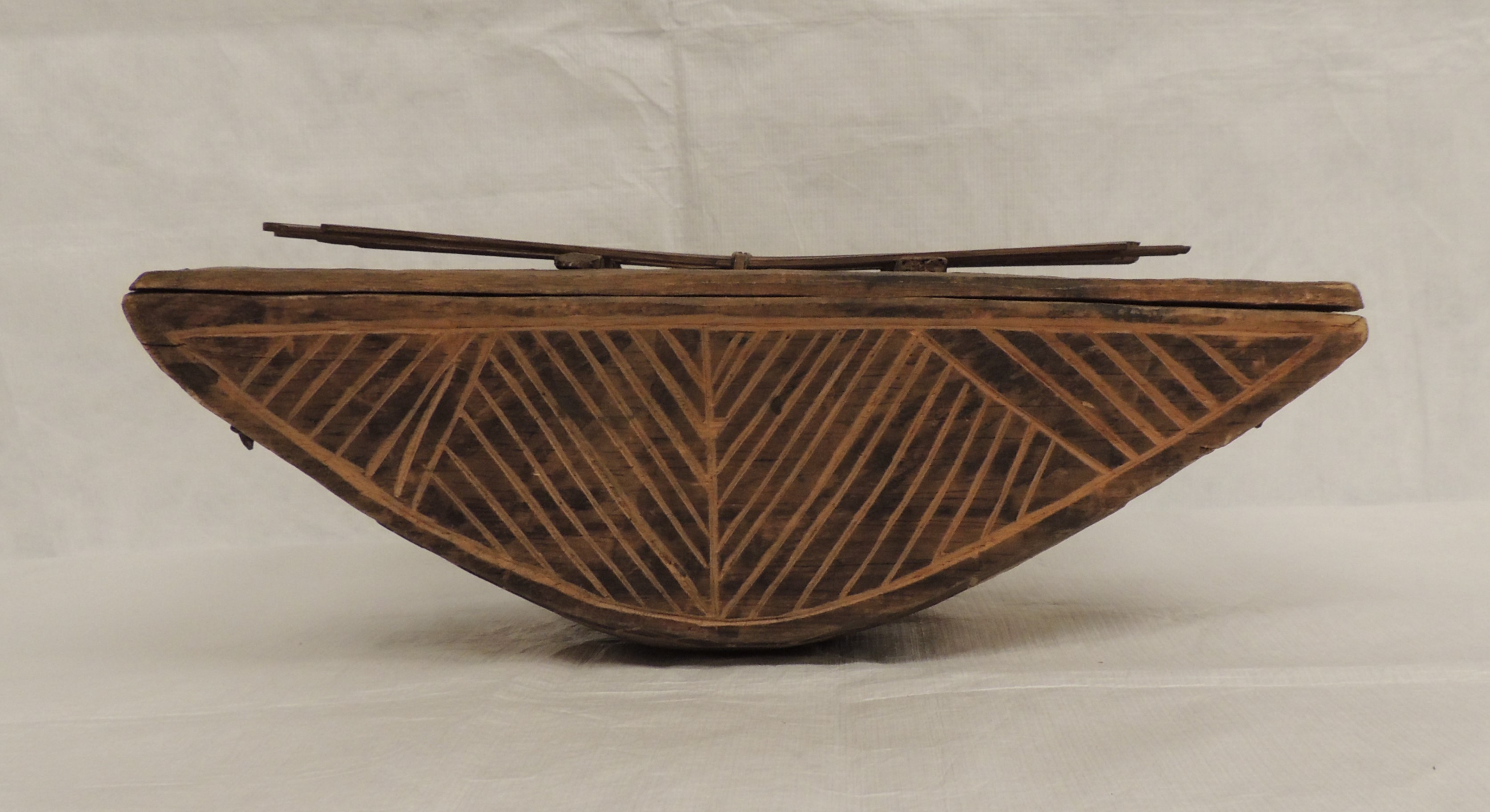 Fabriqué à partir de fines baguettes végétales fixées sur caisse de résonnance, cet instrument de musique entre dans les collections de Nevers en 1886, dans des circonstances encore incertaines. Peu d’informations sont connues sur le donateur, monsieur Virlogeux, pourtant à l’origine d’autres acquisitions du musée provenant du Gabon. Le contexte laisse penser qu’il appartenait au personnel colonial, fortement sollicité dans les années 1880 lors de l’installation de postes et de factoreries pour le commerce et l’administration du Congo français. Cet objet est un idiophone, fabriqué pour produire des sons à partir de la vibration des lamelles entre les mains du musicien. Il existe des modèles rapportés de plusieurs pays d’Afrique dès le XIXe siècle. On les trouve dans les inventaires sous différents noms selon les langues, souvent celui de sanza lorsqu’ils proviennent du Gabon ou du Congo. On en rencontre aussi dont les lamelles sont métalliques. Comme celui de Nevers, certains présentent une caisse de bois profonde décorée de motifs géométriques. Musée de la Faïence et des Beaux-Arts Frédéric Blandin, Nevers
