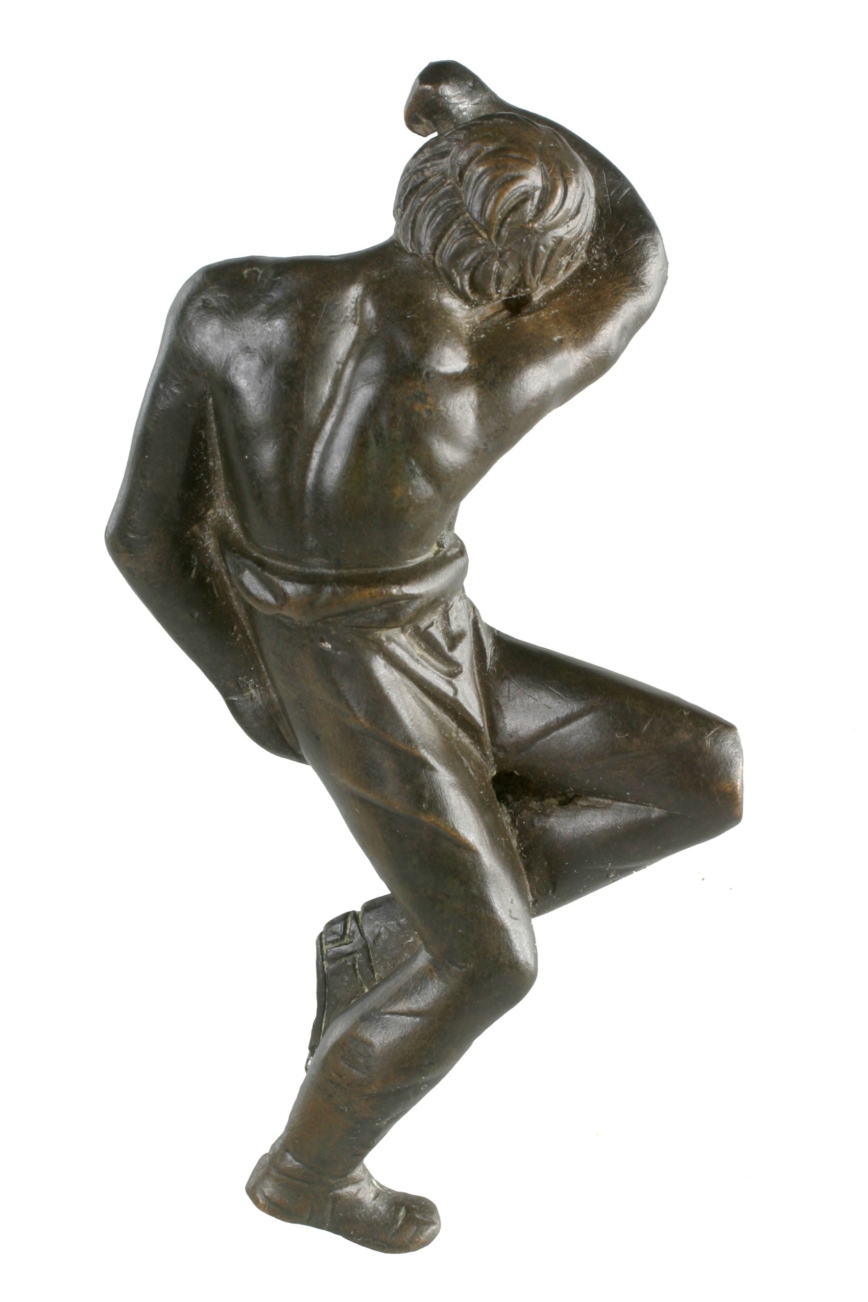 Un petit gaulois couchéQuel symbole, lorsque la Société des Sciences découvre en 1906, une petite statuette en bronze représentant un gaulois portant des braies couché face contre terre !La qualité de la sculpture attire immédiatement l’attention de Victor Pernet, chef de chantier des fouilles : « cette pièce est bien entière et peut avoir de la valeur ». La trace de fixation dans le genou gauche du personnage suggère une utilisation en décor d’applique. Le sujet, un guerrier allongé, comme mort, n’est pas celui d’un décor de mobilier classique. Cette sculpture appartient à la catégorie des emblemata de facture italo-grecque. Dès sa découverte, Emile Espérandieu émet l’hypothèse d’une utilisation en décor de vase, par rapprochement avec une anse ornée conservée au Musée du Louvre. Des hypothèses plus récentes rattachent cette statuette aux figures de bronze qui ornent les harnachements d’apparat (balteus), représentant les combats entre Grecs et Galates sur un balteus conservé au Musée archéologique régional d’Aoste. Ce petit bronze serait-il le seul élément retrouvé d’une statue équestre érigée sur la place publique d’Alésia ? Diffusé par la gravure dès l’année de sa découverte, le « petit Gaulois » est adopté par la Société des Sciences en illustration de couverture de la publication Pro Alésia puis utilisé sur tous supports de communication : bulletins, papier à lettre... Salomon Reinacht compte même sur ce personnage pour soutenir les fouilles d’Alésia : « une image de Gaulois mort, découverte dans la ville romaine qui a remplacé a cité gauloise de Vercingétorix, n’y a-t-il pas là de quoi stimuler la libéralité du public ? » Pro Alésia, 1908. Musée Alésia - Centre d’interprétation Un petit gaulois couché