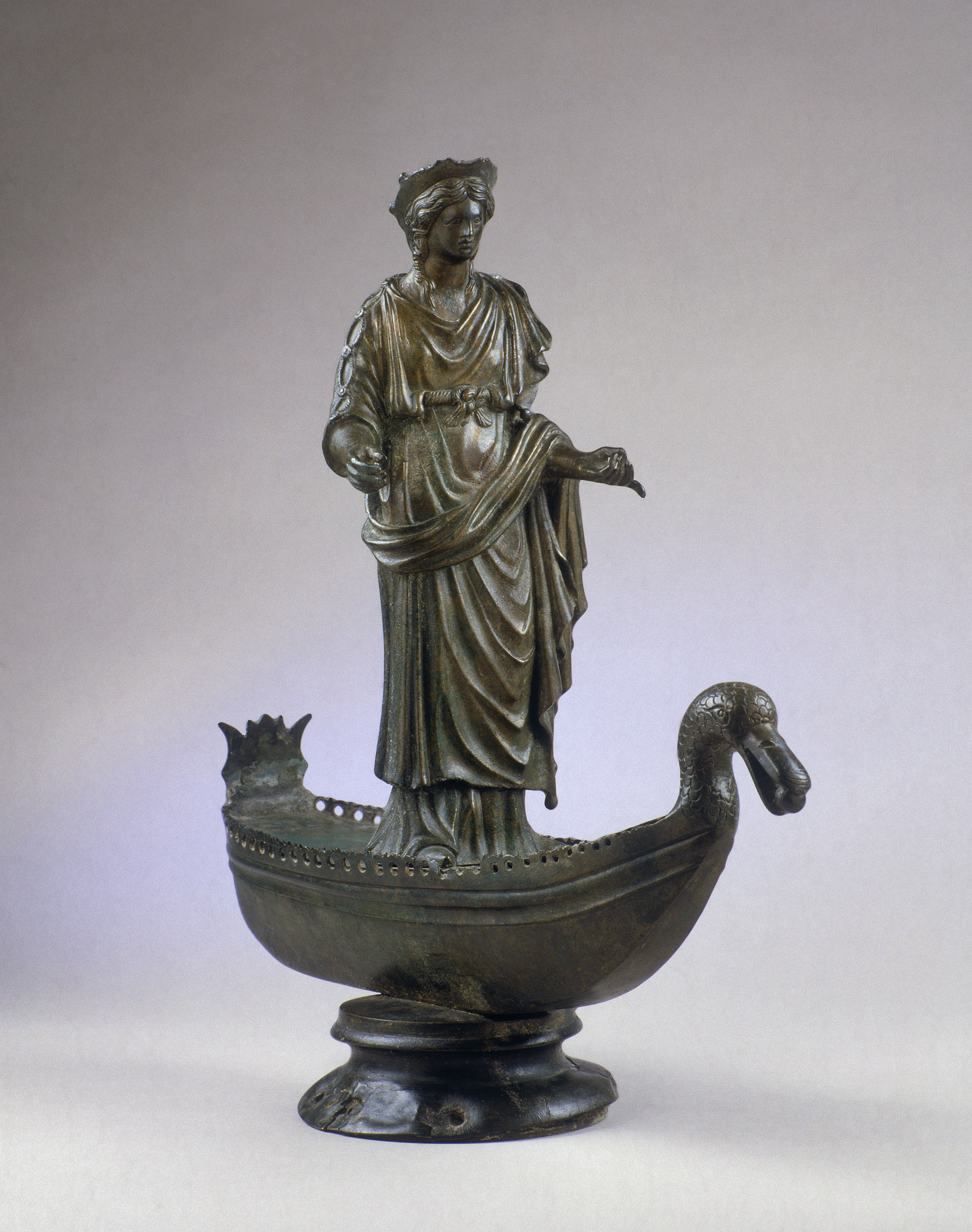 La déesse Sequana sur sa barqueDécouverte en trois morceaux lors de la fouille de 1933 dans une petite fosse, cette statuette remarquable appartenait au « trésor » du temple de l’emblématique sanctuaire des Sources de la Seine. Ce sanctuaire est situé dans un vallon où le fleuve prend naissance en Côte-d’Or. La figure féminine reprend l’iconographie générale de la déesse antique de l’abondance. Elle repose sur une barque à faible tirant d’eau, adaptée à la navigation fluviale régionale, barque dont la proue est constituée d’une tête d’oiseau.