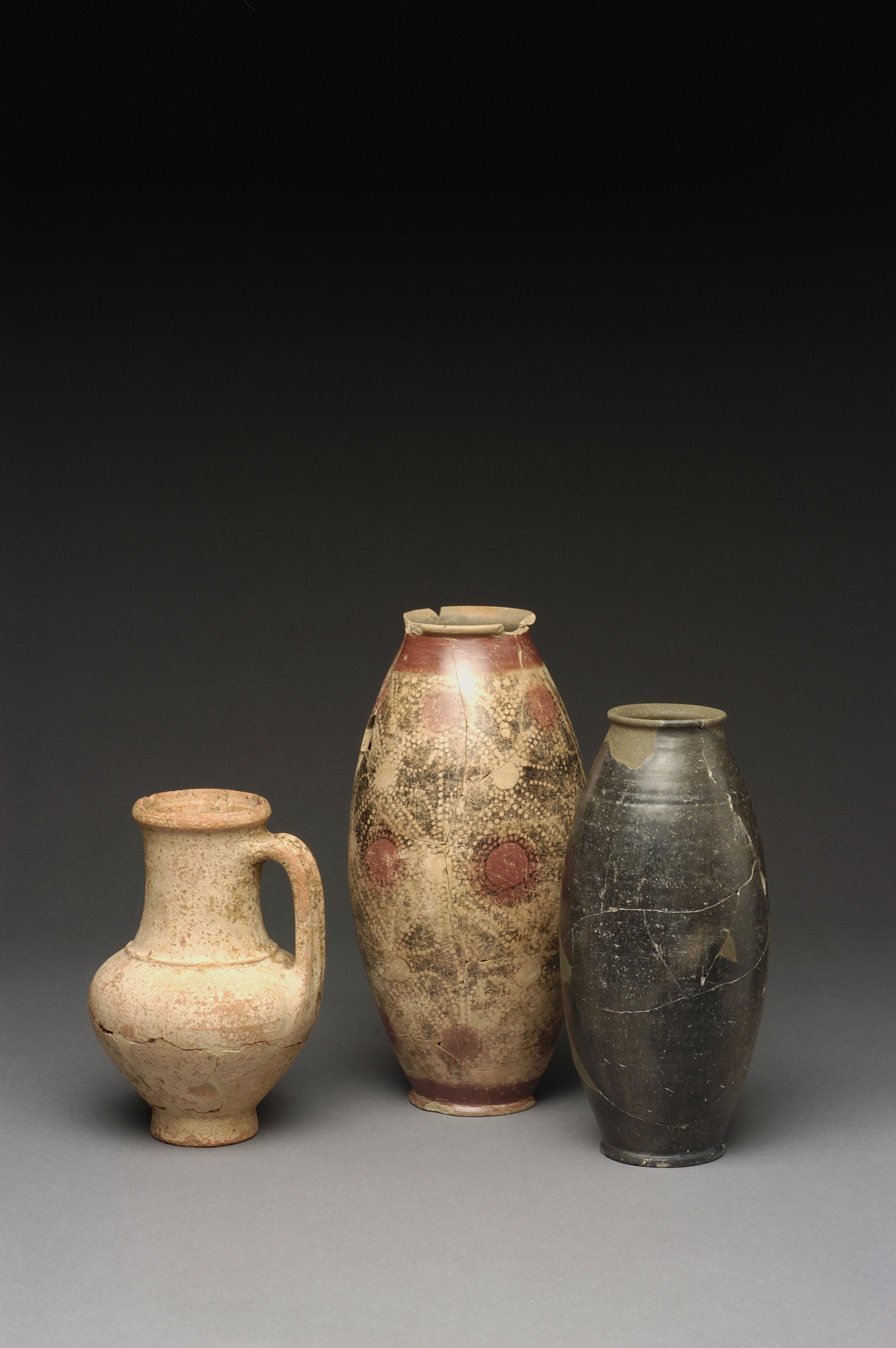 On observe également une petite cruche à pâte claire, témoin de l’importance des importations romaines dans le vaisselier éduen, qui accompagne l’arrivée massive de vin italique et engendre la production d’imitations par les potiers gaulois. Les trois objets ont été découverts dans la même unité stratigraphique, dans le secteur du centre monumental de l’oppidum éduen.1. Vase tonnelet, céramique à pâte grise fine lissée et fumigée