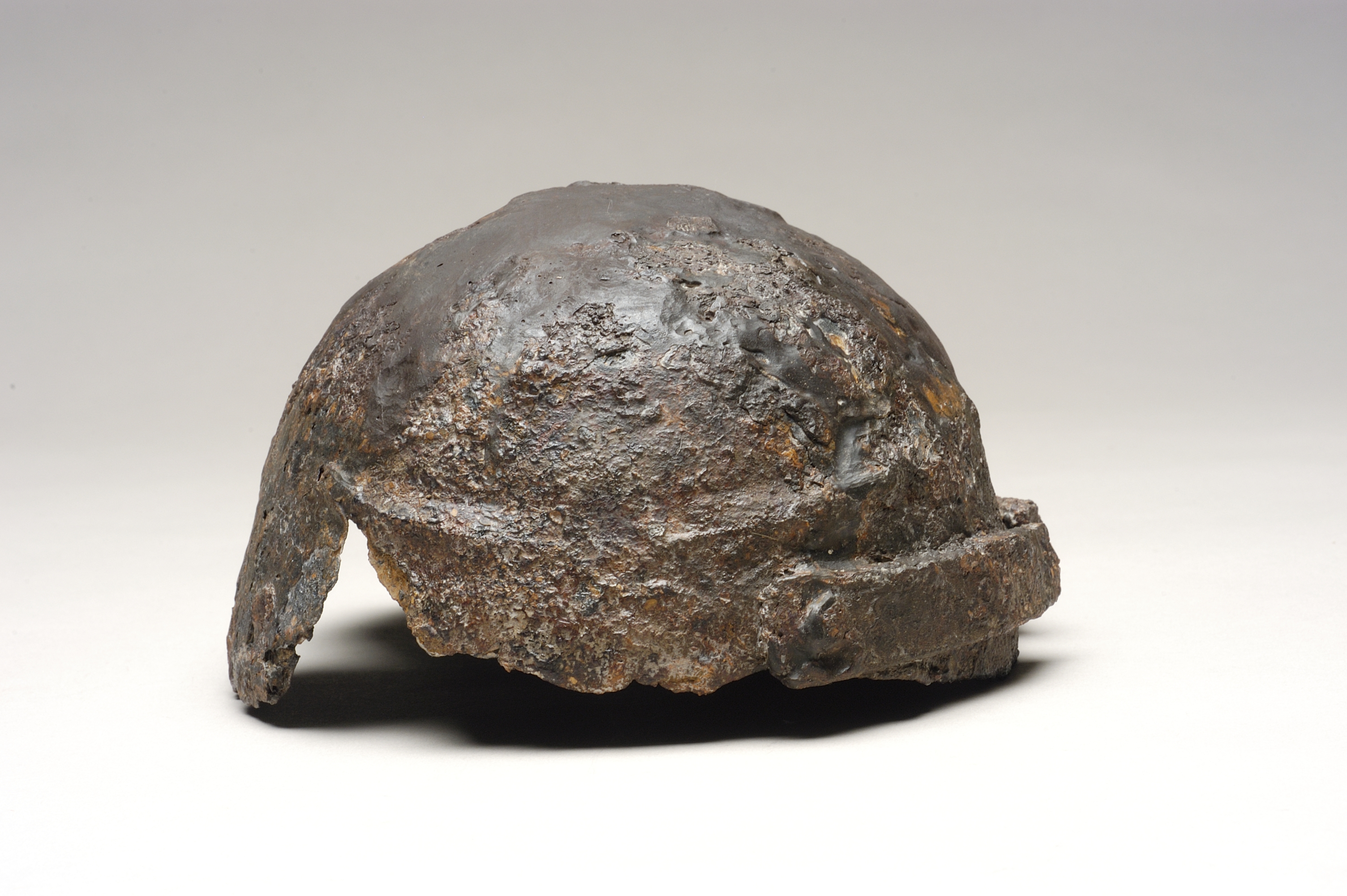 Casque de type Port recyclé en louche de fondeurCentre politique et religieux, l’oppidum de Bibracte est également un centre de production artisanale extrêmement dynamique, qui participe au rayonnement de la capitale éduenne à l’échelle régionale et au-delà. Le long de son avenue principale, tout comme dans d’autres secteurs du site, les archéologues ont mis au jour plusieurs dizaines d’ateliers de travailleurs du métal. Forgerons et bronziers produisent des objets de types variés, fibules, outils, armes, ornements de char, etc., selon des chaines opératoires standardisées. Découvert dans l’un de ces ateliers, cette calotte en fer a servi de creuset pour faire fondre et verser le métal en fusion. Mais cet objet a eu une première vie avant de tomber dans les mains de l’artisan, puisqu’il s’agit en fait d’un casque de soldat, doté de sourcils marqués au repoussé, qui a été modifié par sciage de sa base et ajout d’un petit bec verseur et de barres rivetées pour le maintien d’un manche. Musée Bibracte Casque de type Port recyclé en louche de fondeur