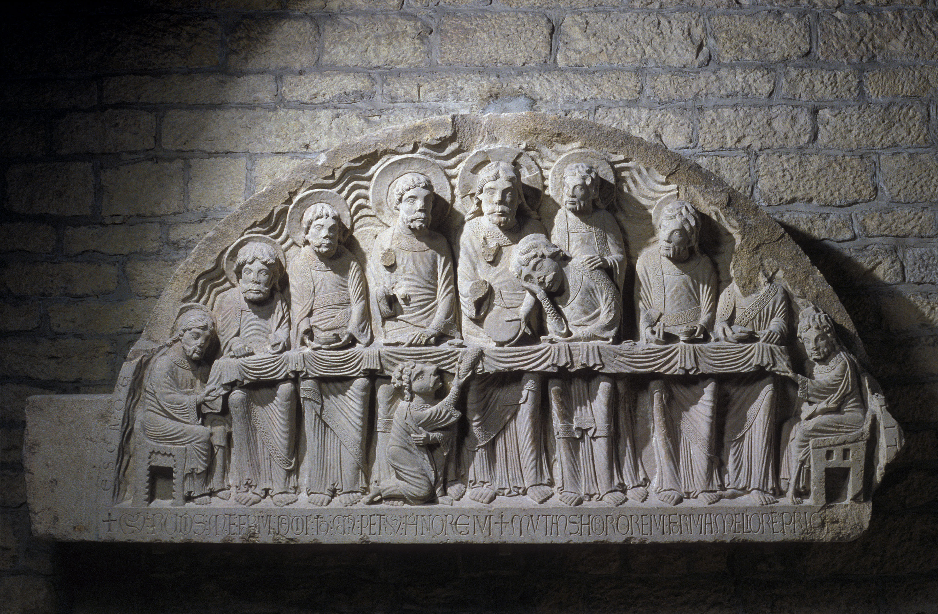Tympan de Saint BénigneCe tympan représente la Cène : Jésus, au centre, bénit de la main droite le pain et se tient derrière une longue table recouverte d’une nappe, qui créé un fil entre les différents protagonistes de la scène ; de part et d’autre, des apôtres assistent à ce moment fondateur pour la liturgie chrétienne. Judas, isolé au premier plan, se dévoile en saisissant le plat. La sculpture est soignée, les vêtements épousent la forme des corps, les bordures sont décorées ; tout un ensemble de détails, comme des gobelets, du pain donnent davantage de saveur à cette représentation. Cette œuvre, datée du troisième quart du XIIe siècle, provient de l’abbaye Saint-Bénigne, un couvent majeur dans l’histoire de la ville de Dijon et l’un des plus importants de Bourgogne, fondé au début du VIe siècle et rattaché à Cluny au Xe siècle. L’une des hypothèses, notamment en raison de la scène de repas représentée, est que ce tympan prenait place à l’entrée du réfectoire des moines, aujourd’hui disparu. Musée archéologique Tympan de Saint Bénigne