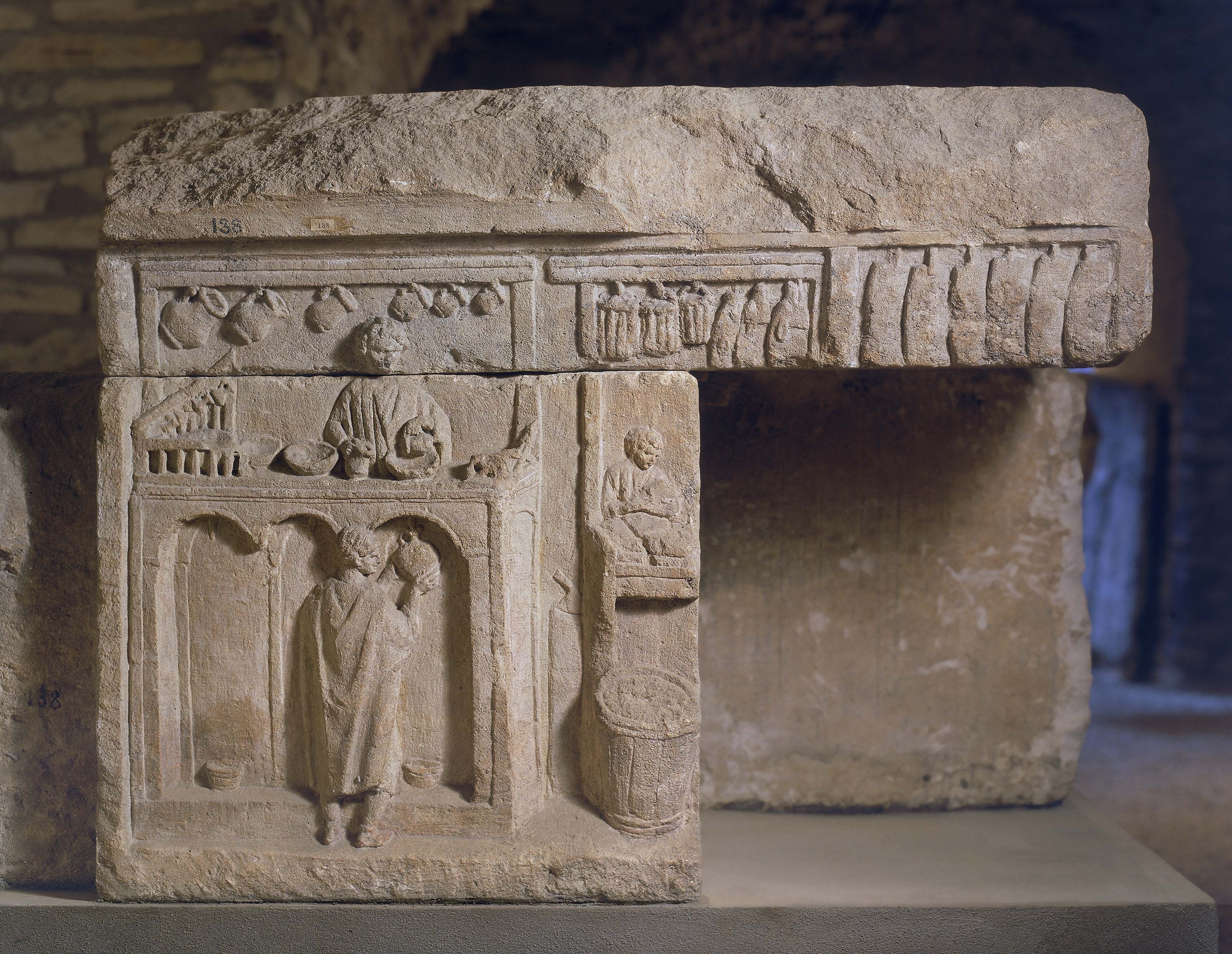Monument funéraire dit du marchand de vinCet élément sculpté, découvert à Til-Châtel, la station routière Tilena de la Table de Peutinger, appartenait à un vaste monument funéraire gallo-romain d’une famille. La scène historiée fragmentaire représente une série de boutique, sous la forme de comptoir, dont une boucherie reconnaissable aux têtes de cochons et aux chapelets de saucisses ou de boudins et autres différents ustensiles. La scène emblématique est celle d’une vente de vin au détail réalisée à partir de vases-mesures au travers d’entonnoirs. Témoin vivant de la vie quotidienne et des activités de la famille des défunts, ces reliefs attestent non seulement du commerce de bouche au sein des agglomérations antiques mais surtout de l’exploitation de vignobles et du commerce de vin sur ce territoire dès l’Antiquité. Ces derniers ont été corroborés par les découvertes archéologiques en particulier celle en 2019 d’une parcelle plantée de vignes datant du IIe siècle sur la commune de Gevrey-Chambertin. Musée archéologique Monument funéraire dit du marchand de vin
