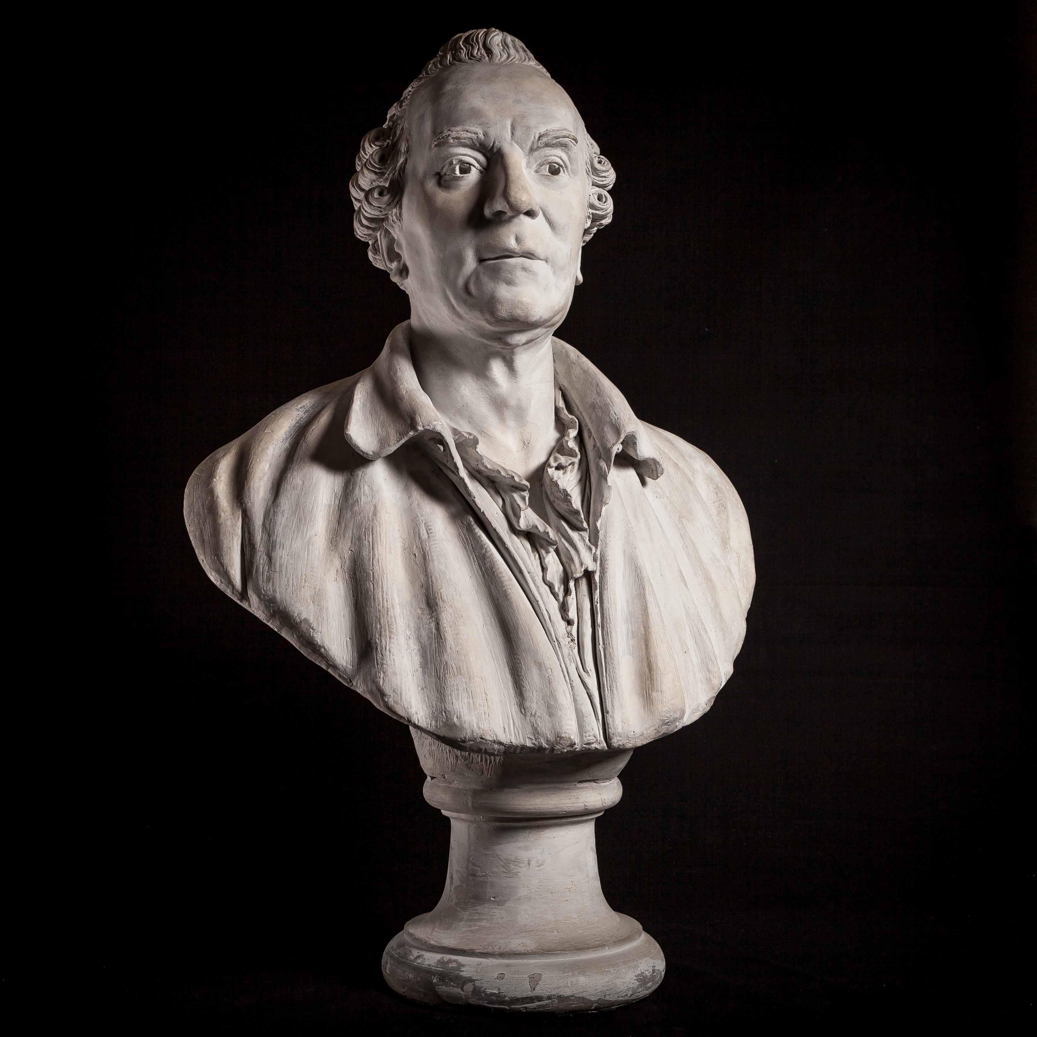 Buste de Buffon Ecole françaiseExécuté probablement de son vivant, ce buste présente Buffon la chemise ouverte, le visage neutre et le regard lointain, rappelant le buste réaliste de Houdon de la même période et apportant de la vitalité à cette vision du naturaliste. Seule la chevelure savamment maîtrisée anime le visage de Buffon.