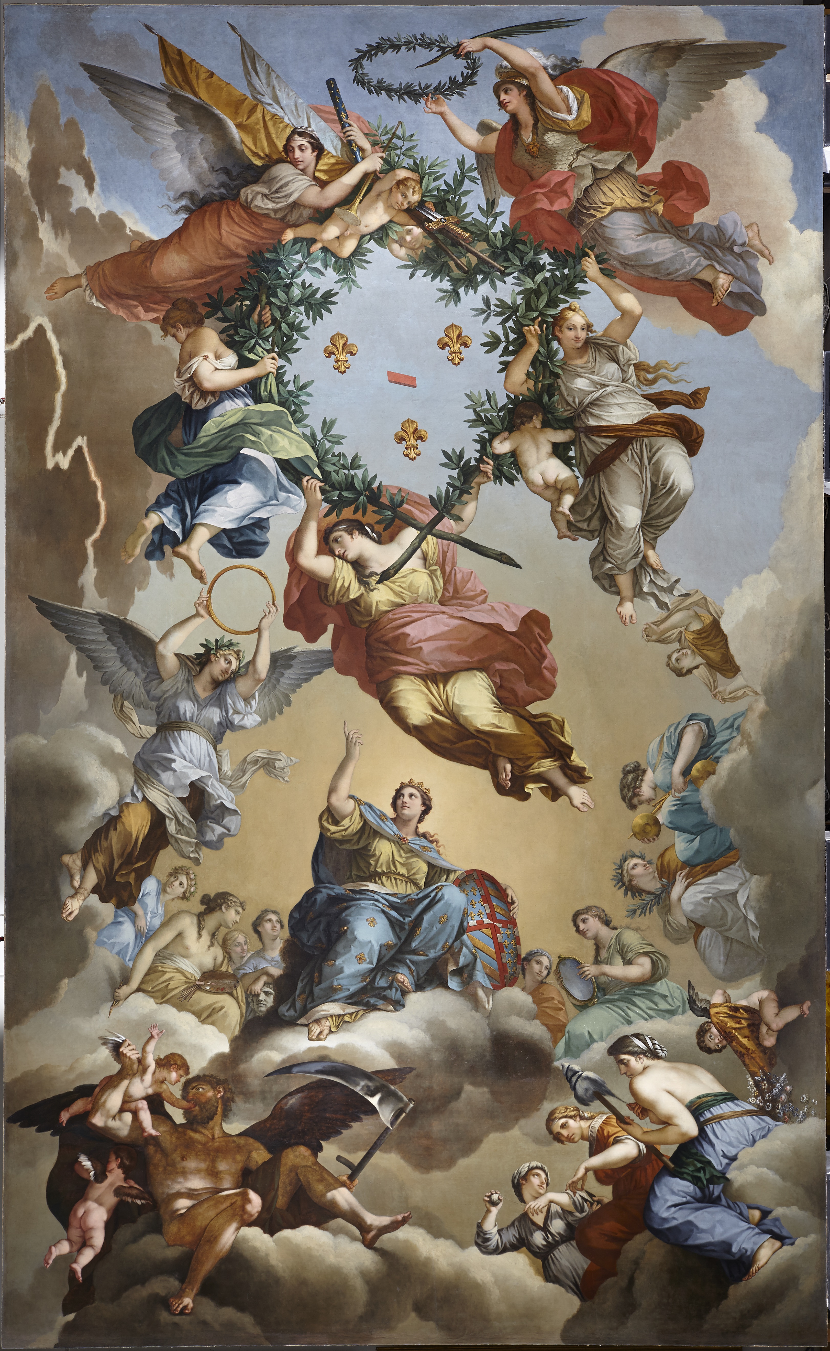 Allégorie de la Bourgogne (SB) Pierre-Paul Prud’honEn 1786, les États de Bourgogne choisirent Pierre-Paul Prud’hon pour réaliser l’immense toile décorative qui devait orner le plafond de la salle des Statues du premier musée de Dijon. Élève de l’École de dessin et lauréat du prix de Rome depuis 1784, Prud’hon avait commencé son séjour dans la Ville éternelle. Cette commande à la gloire de la Bourgogne conciliait ainsi la vocation du musée à présenter les œuvres des bénéficiaires du prix institué par les États de Bourgogne depuis 1776 et les exigences de la célébration politique des gouverneurs de la province, les princes de Condé. Reconnaissable à l’écu sur lequel elle s’appuie, la Bourgogne personnifiée est drapée dans un manteau fleurdelisé et désigne au-dessous d’elle les armes des Condé, composées des trois fleurs de lys et de la brisure de bâtardise. Prud’hon mettra un peu plus d’un an pour réaliser cette œuvre, envoyée à Dijon en avril 1787 et installée dans la salle des statues. Musée des Beaux-Arts Allégorie de la Bourgogne (SB) Pierre-Paul Prud’hon
