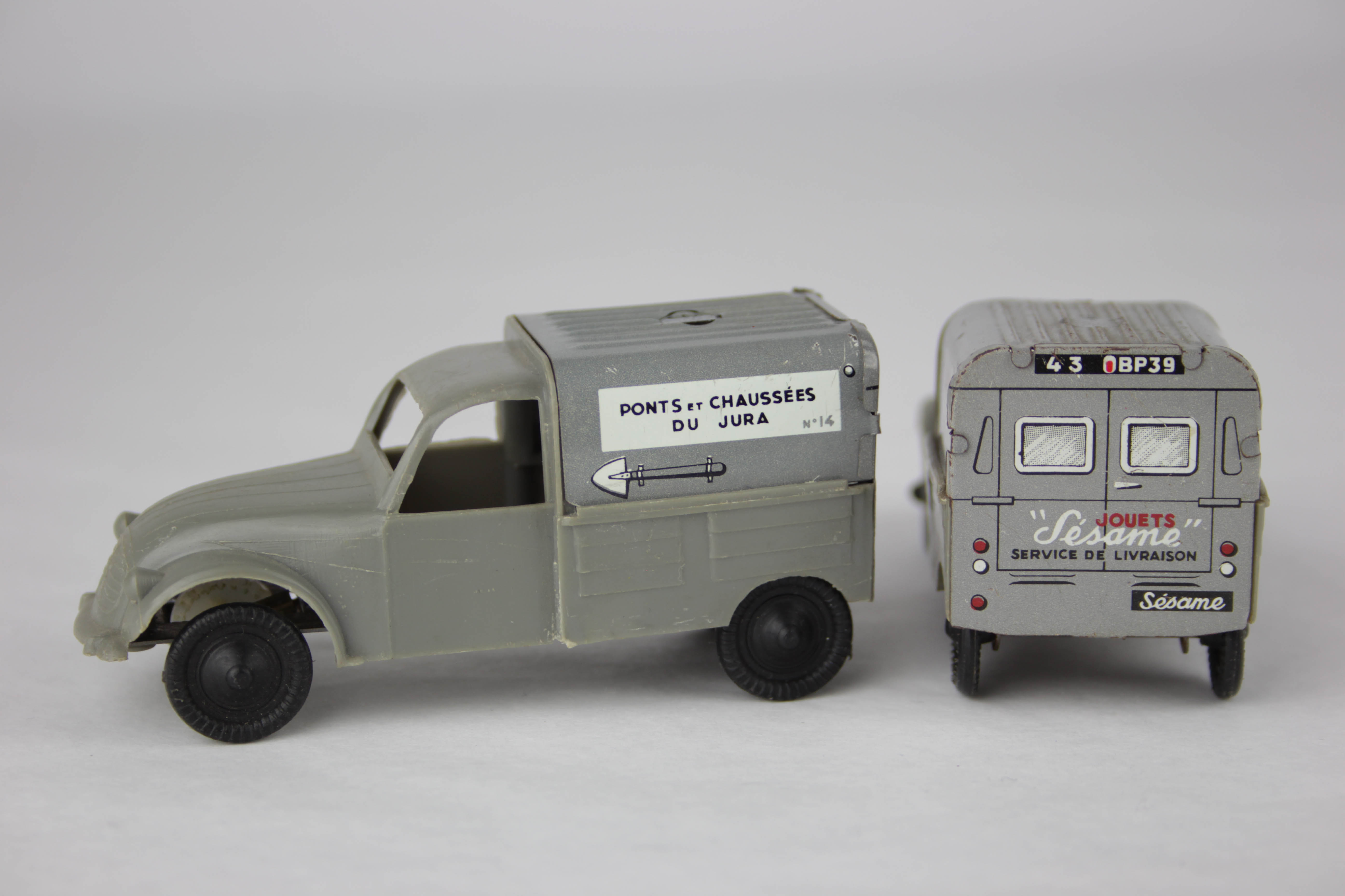 Citroën 2CV fourgonnette « Service de livraison jouets Sésame » et « Ponts et chaussées du Jura »Fondée en 1884 à Saint-Claude, la société Sésame fabrique des articles publicitaires. À partir de 1955, elle propose à ses clients un nouveau support, en plus des porte-plume et autres portemines : le jouet et plus particulièrement les petites voitures. Les véhicules sont vendus à un prix dérisoire (2 Fr pour le modèle à friction) et font référence à des marques internationales (Coca-Cola) mais aussi locales ou peu connues (La vache Grosjean, Plastique Gilac...). Mais même lorsque la camionnette fait la publicité du soda américain, elle est immatriculée « 39 », dans le Jura ! Musée du jouet Citroën 2CV fourgonnette « Service de livraison jouets Sésame » et « Ponts et chaussées du Jura »