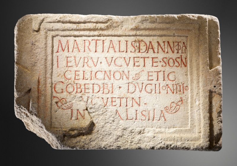 La pierre « in Alisiia »A L I S I I A . Quelques lettres interprétées comme le nom local de l’oppidum des Mandubiens font la célébrité de cette inscription.Le texte est complet et se déchiffre sans trop de peine : MARTIALIS DANNOTALIIEURU VCUETE SOSINCELICNON ETICGOBEDBI DUGIIONTIIOVCUETININ ALISIIASon interprétation prendra plus de temps. L’année 1908 marque un tournant. Les recherches historiques et linguistiques progressent : proposition de traduction de godbedbi par « forgeron » à la lumière du témoignage de Pline l’Ancien, comparaison de la langue gauloise avec le vieil-irlandais. La Société des Sciences de Semur découvre dans les décombres du sous-sol du monument principal du site, un ensemble de mobilier métallique et notamment un vase orné d’une inscription mentionnant Ucuetis. Un lien est tissé entre cette pierre et l’édifice qui sera appelé « Monument d’Ucuetis » et interprété comme le lieu de réunion des métallurgistes d’Alésia. L’inscription, monumentale avec queues d’aronde et ses moulures, devait être fixée sur l’un des murs du monument. En 1979, Michel Lejeune en donne une traduction définitive ainsi qu’une datation au milieu du Ier siècle après J.-C., d’après la structure et l’alphabet utilisé : « Martialis, fils de Dannotalos, a offert à Ucuetis ce bâtiment, et cela avec les forgerons qui honorent Ucuetis à Alisiia ». Les chercheurs s’accordent aujourd’hui sur une datation entre le 3e quart du Ier siècle de notre ère et le début du IIe siècle. Cette longue inscription constitue un témoignage remarquable sur une langue disparue et atteste que la ville avait gardé après la conquête, au moins localement, son nom gaulois. Le nom latin « Alesia », usité dans l’administration romaine, supplante le toponyme celte qui finit par disparaître au VIe ou VIIe siècle. Musée Alésia - Centre d’interprétation La pierre « in Alisiia »
