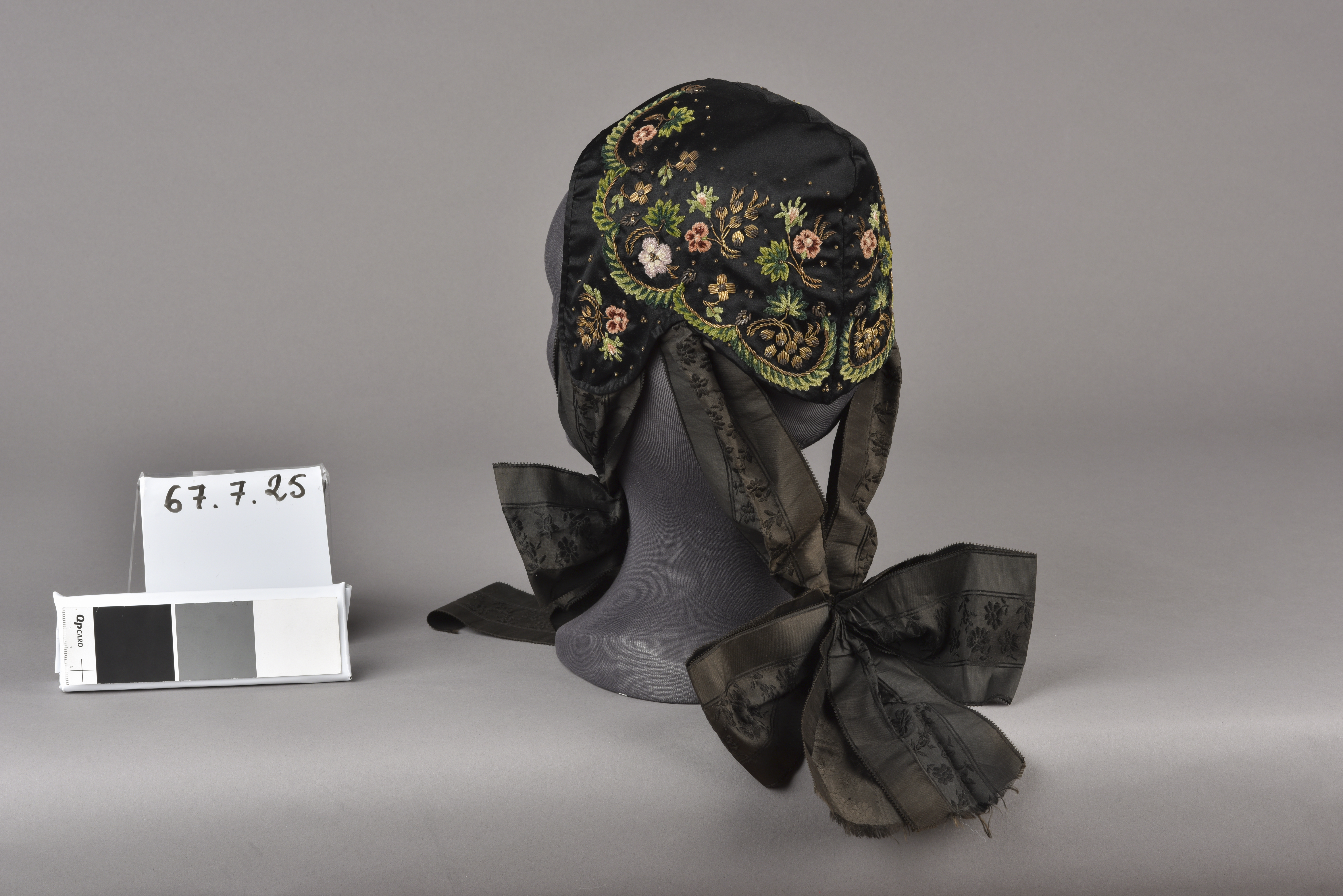 Câle à diairiLa câle à diairi, ou bonnet à chignon, est une coiffe traditionnelle du Pays de Montbéliard. Le modèle est constitué de deux faces identiques assemblées par une couture médiane. Le bonnet est généralement doublé d’une toile écrue, parfois de verquelure, rarement d’une indienne, quelquefois matelassé. Un biais souvent en satin assure la finition du bord. D’après l’iconographie et les exemplaires récents, de larges rubans sont fixés au niveau des oreilles et de la nuque, les premiers noués sous le menton, les seconds sur le dessus de la tête ou retombant sur la nuque. Un grand nombre de ces coiffes n’ont pas conservé leurs rubans usés. Cette coiffe est devenue un emblème identitaire incontournable du Pays de Montbéliard, directement lié au protestantisme. La collection des musées de Montbéliard compte actuellement plus de 400 câles à diairi. Musée d’Art et d’Histoire, hôtel Beurnier-Rossel Câle à diairi