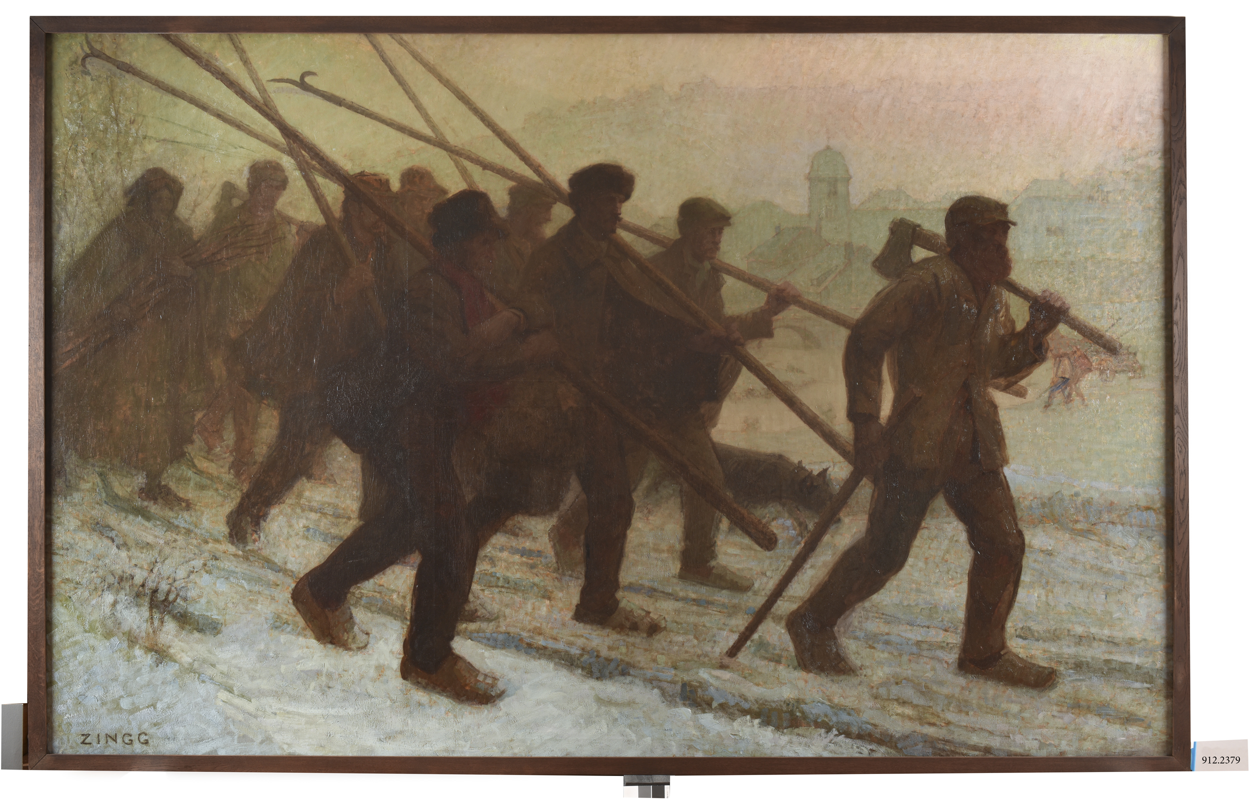 Les tireurs de glace Jules-Émile ZINGGPeintre né à Montbéliard en 1882, Jules-Émile Zingg est un artiste franc-comtois incontournable reconnu pour ses paysages et ses scènes de vie quotidienne urbaine ou rurale. Il entre à l’École des beaux-arts de Besançon dans l’atelier de Félix Giacomotti en 1901 et en 1902, il est admis à l’École des beaux-arts de Paris dans l’atelier de Fernand Cormon. Il se spécialise dans la peinture de paysages et obtient le titre de second lauréat du prix de Rome de 1911. Il présente cette œuvre au Salon des Artistes Français de 1910 pour laquelle il obtient une médaille.