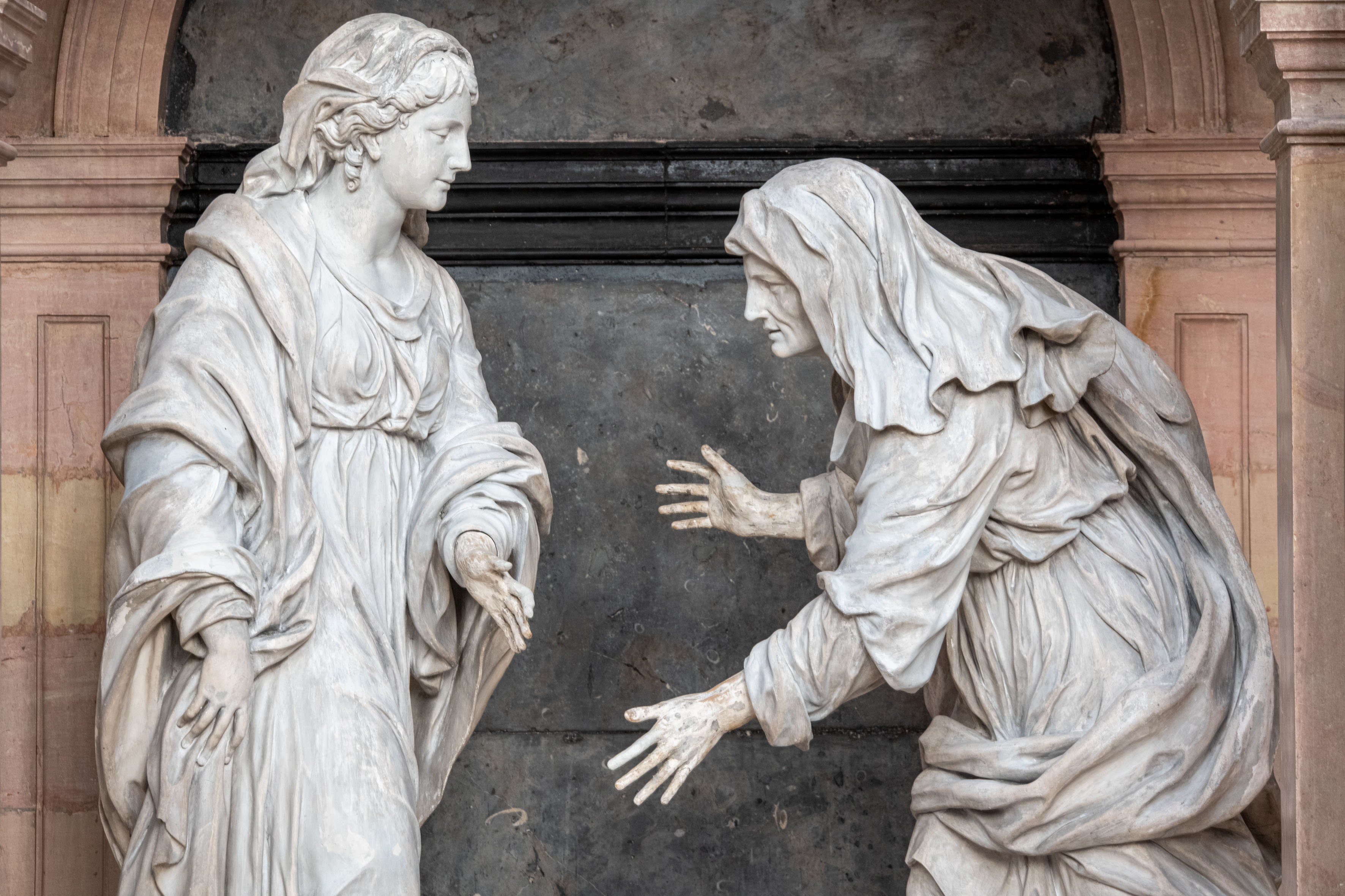 Dubois, Maître-autel Jean DuboisProvenant de la chapelle Sainte Anne, cet autel à baldaquin abrite le groupe de la Visitation sous un dais : la Vierge Marie rend visite à sa cousine Elisabeth qui attend, malgré son âge avancé, un fils. Elisabeth marche à la rencontre de Marie et s’incline légèrement devant elle avec un geste de bienvenue. Le soubassement est en marbre noir et calcaire oolithique rose de Bourgogne (Chassagne ou Dijon) et la table en calcaire à gryphées arquées.