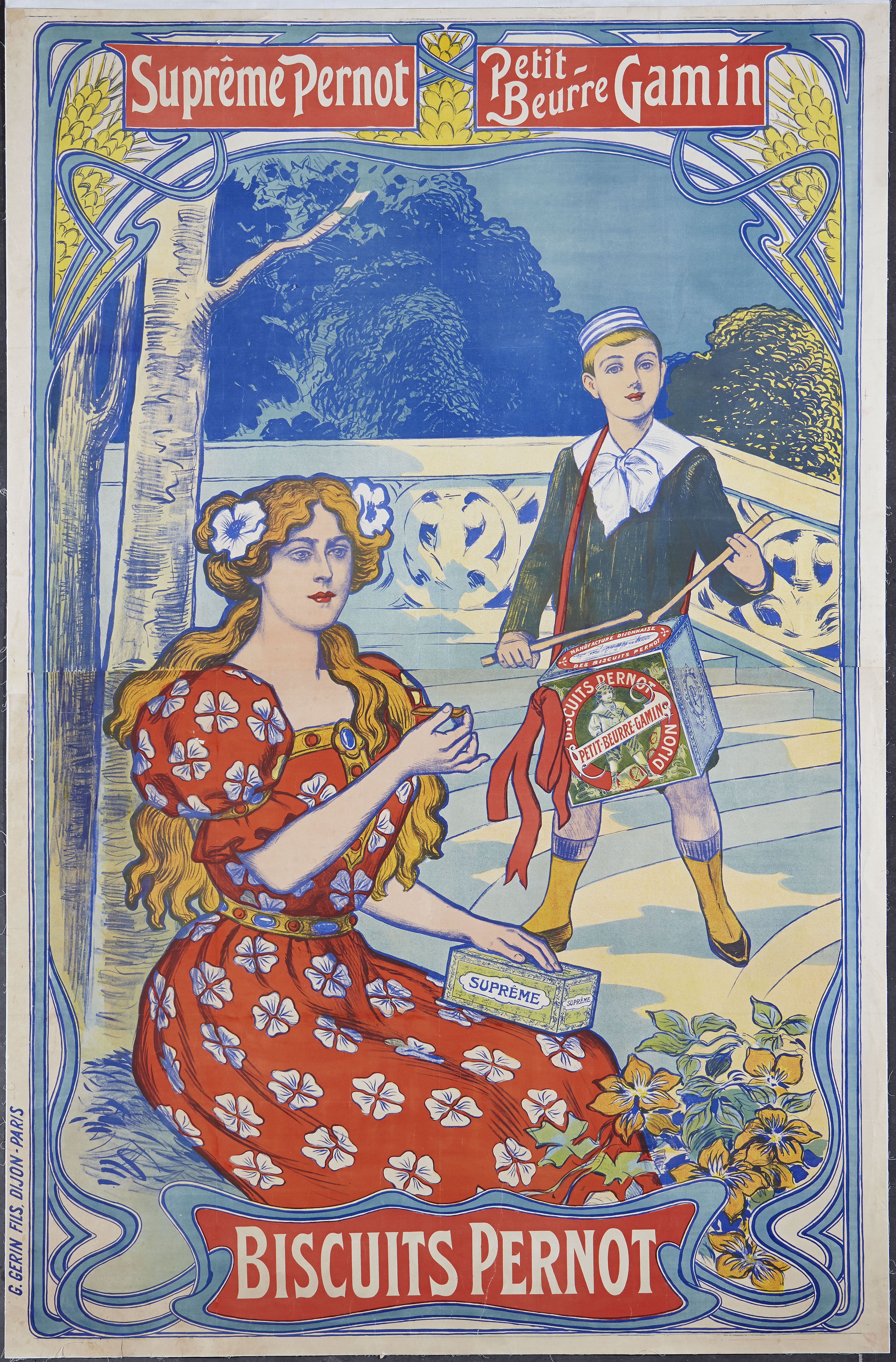 Affiche Pernot - Suprême Pernot, Petit-Beurre Gamin E. GexLa fin du XIXe siècle voit en France l’émergence d’une industrie de pâtisserie sèche : Lefèvre Utile en 1887 (Petit-Beurre LU) à Nantes et quelques années plus tôt en 1883 Pernot à Dijon.