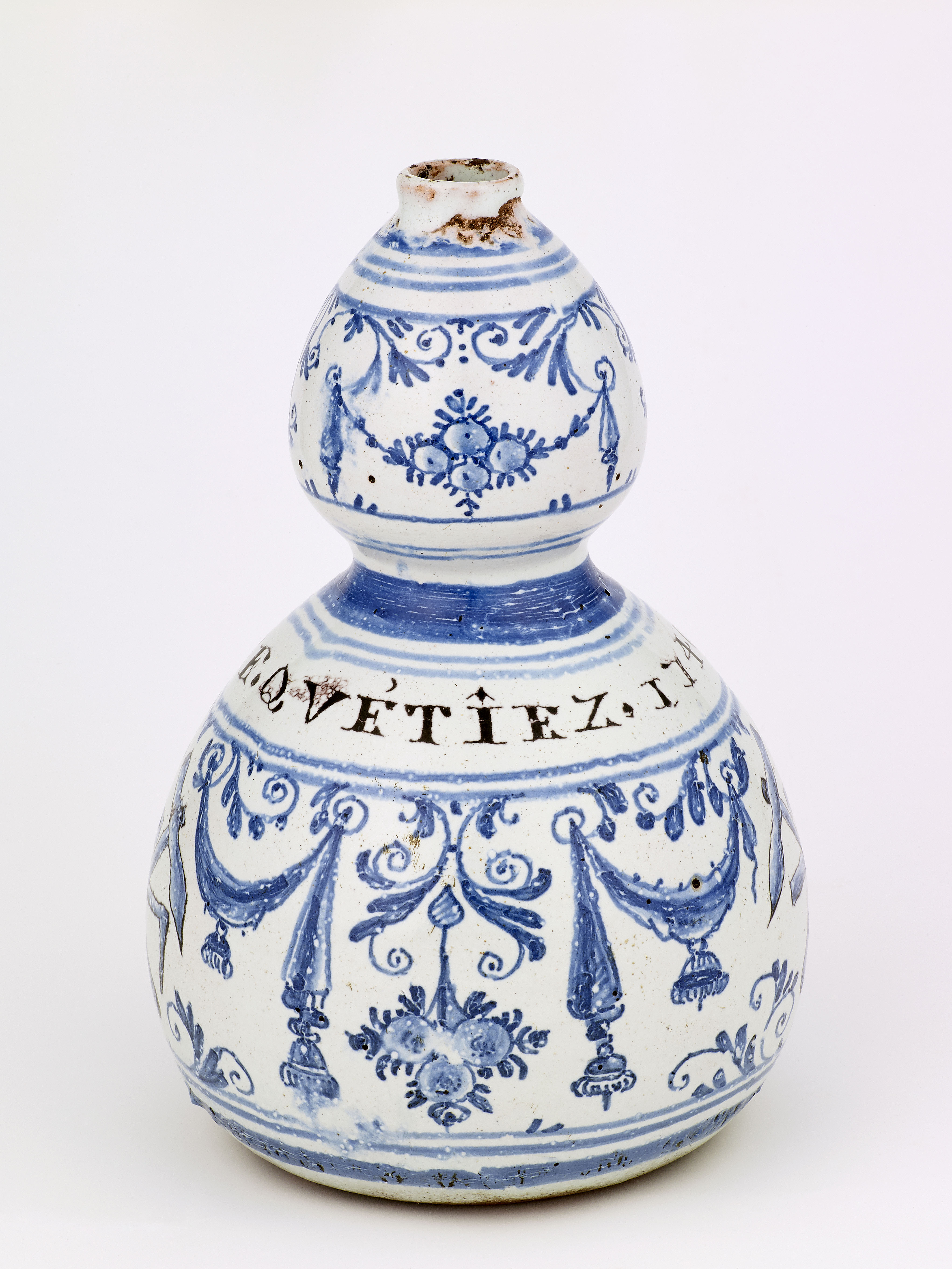 Gourde patronymique à deux renflements, 1740 Nicolas CoupletCette gourde patronymique à décor de grand feu en camaïeu bleu et noir a été produite par la fabrique de la rue Maison-Rouge (1692-1755), seconde manufacture de faïence à Dijon.