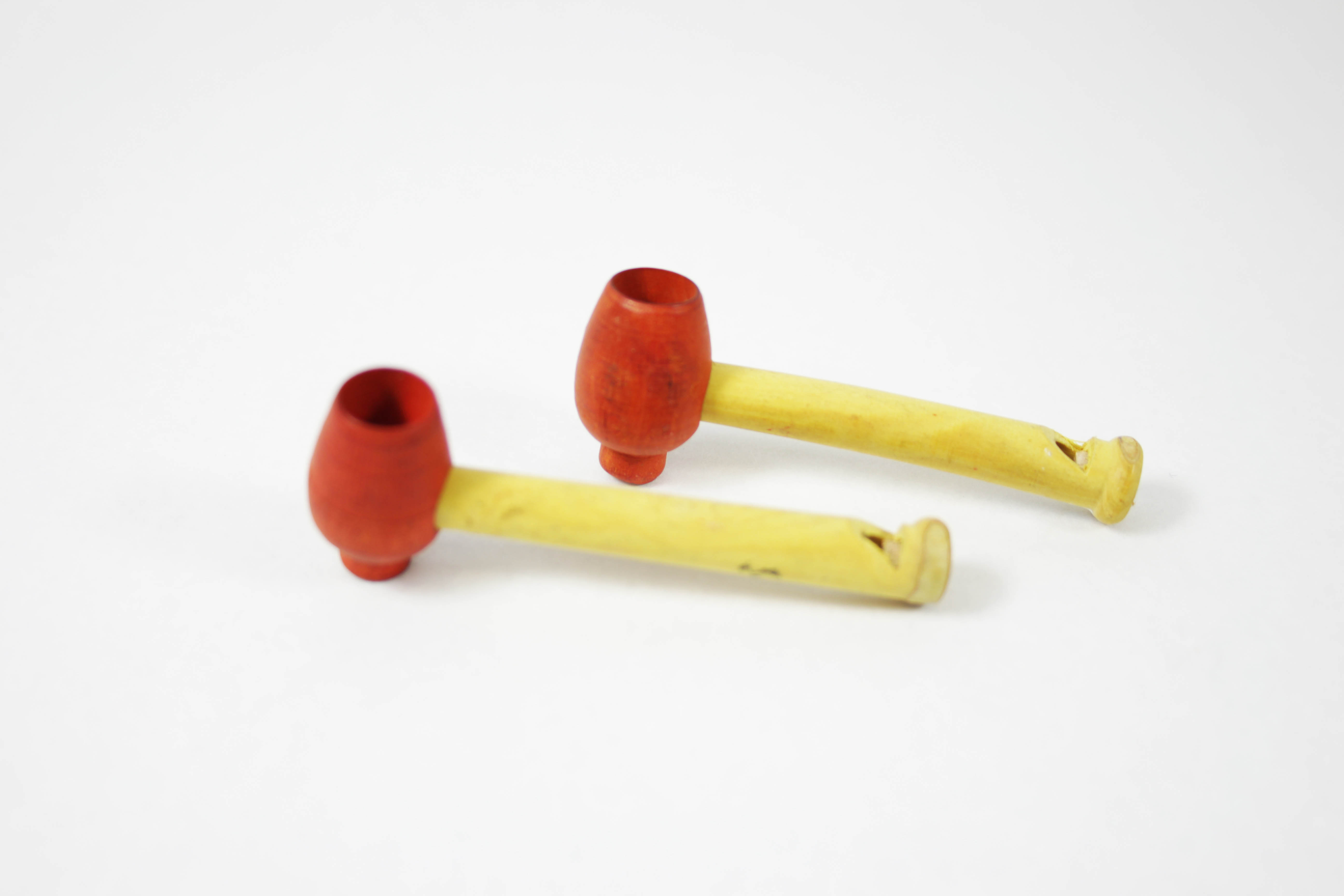 Sifflets-pipesAu milieu du 19e siècle, la ville de Saint-Claude se spécialise dans la fabrication de pipes en bruyère. L’essor de cette industrie est tel qu’il y aura jusqu’à 6000 ouvriers pipiers pour 14000 habitants. Les pipes de Saint-Claude sont commercialisées partout : en France, mais également en Europe, aux Etats-Unis et même en Australie. Mais à la fin de la Seconde Guerre mondiale, la concurrence accrue, l’abandon de la pipe pour la cigarette et les campagnes anti-tabac entraînent une crise qui pousse les industriels à diversifier leur production. Certains, comme Dessoy à Moirans-en-Montagne, se tournent vers le jouet et proposent parfois des articles rappelant leur ancienne activité. C’est ainsi que bien avant les campagnes de prévention et les études sur la dangerosité du tabac, on offrait des sifflets en forme de pipes aux enfants ! Musée du jouet Sifflets-pipes
