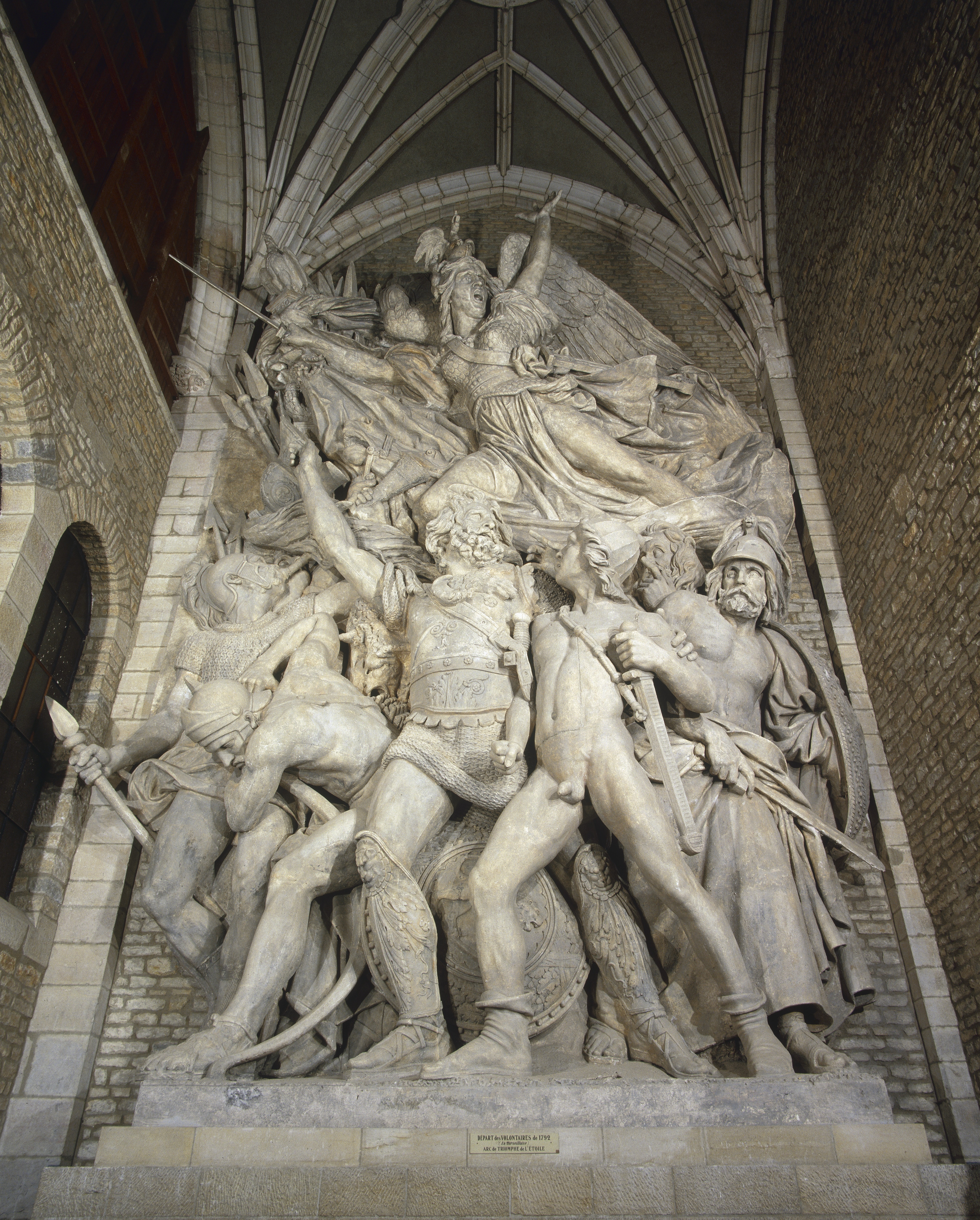 La Marseillaise François RudeLa construction de l’Arc de Triomphe de l’Étoile est un projet initié par Napoléon en 1806, pour honorer la Grande Armée. Le monument, symbole de la réconciliation nationale, sera achevé seulement sous la Monarchie de Juillet en 1836. Quatre ensembles sculptés sont prévus pour les deux faces de l’Arc : Le Départ des Volontaires de 1792, Le Triomphe de Napoléon, La Défense du sol et La Paix. Ce haut-relief évoque donc cet épisode de la Révolution où la patrie est déclarée en danger, et où, face à la coalition européenne, on en appelle aux volontaires civils pour défendre la République. Rude opère ici une synthèse des formes et des inspirations classiques et antiques (torses traités d’après des modèles antiques, nudité héroïque, armements gallo-romains...) et du souffle romantique qui règne à cette époque. La prééminence du mouvement, l’élan apporté au traitement des foules et la déformation du visage de l’allégorie sommitale offrent une toute nouvelle manière de traiter cet épisode. Cette œuvre iconique est devenue un symbole du patriotisme : le Génie de la Liberté est communément appelé la Marseillaise, puisque très tôt on l’a identifié au chant de Rouget de l’Isle qui a galvanisé les troupes françaises en 1792. Musée Rude La Marseillaise François Rude